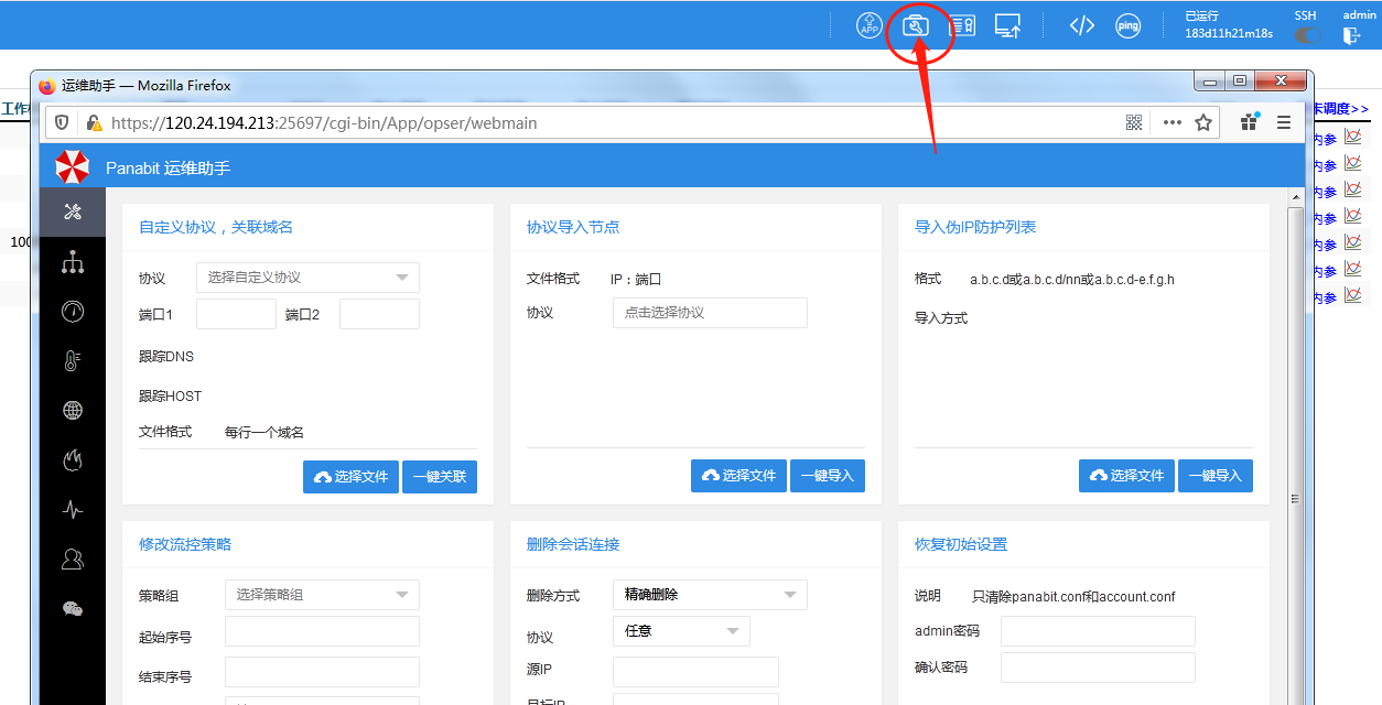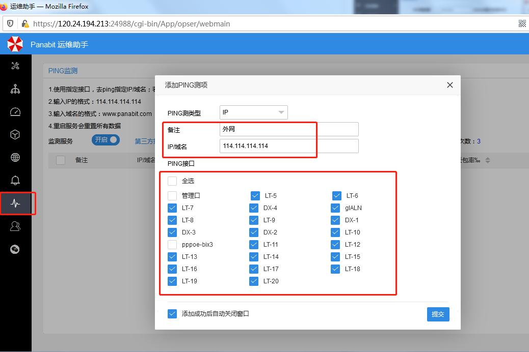 目录 搜索 Panabit一,快速判断WAN口是否异常丢包二,PING用户的延时教程三,派网内网环境下访问外网光猫四,添加外线教程五,连接数控制六,流量控制七,绑定单用户指定外线八,客户拨号718和691报错处理九,添加端口映射与DDNS十,panabit运维助手十一,pa网对接日志教程十二,pa网对接缓存ixcache教程十三,拦截电信运营商弹窗十四,地址池定时踢客户下线十五、自定义域名指定线路出口华为OLT一,备份华为OLT配置文件数据二,华为OLT一些相关命令三,光衰值分光说明华为网管U2000U2000网页界面相关操作运维助手奇妙之处一、批量添加外线增加心跳,判断资源故障二、系统体检【检测系统时间补漏洞】三、ping检测【判断资源延迟状态】 暂无相关搜索结果! 本文档由 智慧光迅 发布 三、ping检测【判断资源延迟状态】 注:此功能不推荐长期使用,否者日志涨的很多后会造成故障!(日志空间存储一直涨)1:开启Ping检测,添加需要通信的IP,添加需要判断的外线2:检测判断外线资源哪些延迟大的情况3:测试完后,尽量关闭检测服务,避免消耗进程注:此功能不推荐长期使用,否者日志涨的很多后会造成故障!(日志空间存储一直涨)1:开启Ping检测,添加需要通信的IP,添加需要判断的外线2:检测判断外线资源哪些延迟大的情况3:测试完后,尽量关闭检测服务,避免消耗进程文档更新时间: 2021-04-06 16:17 作者:admin