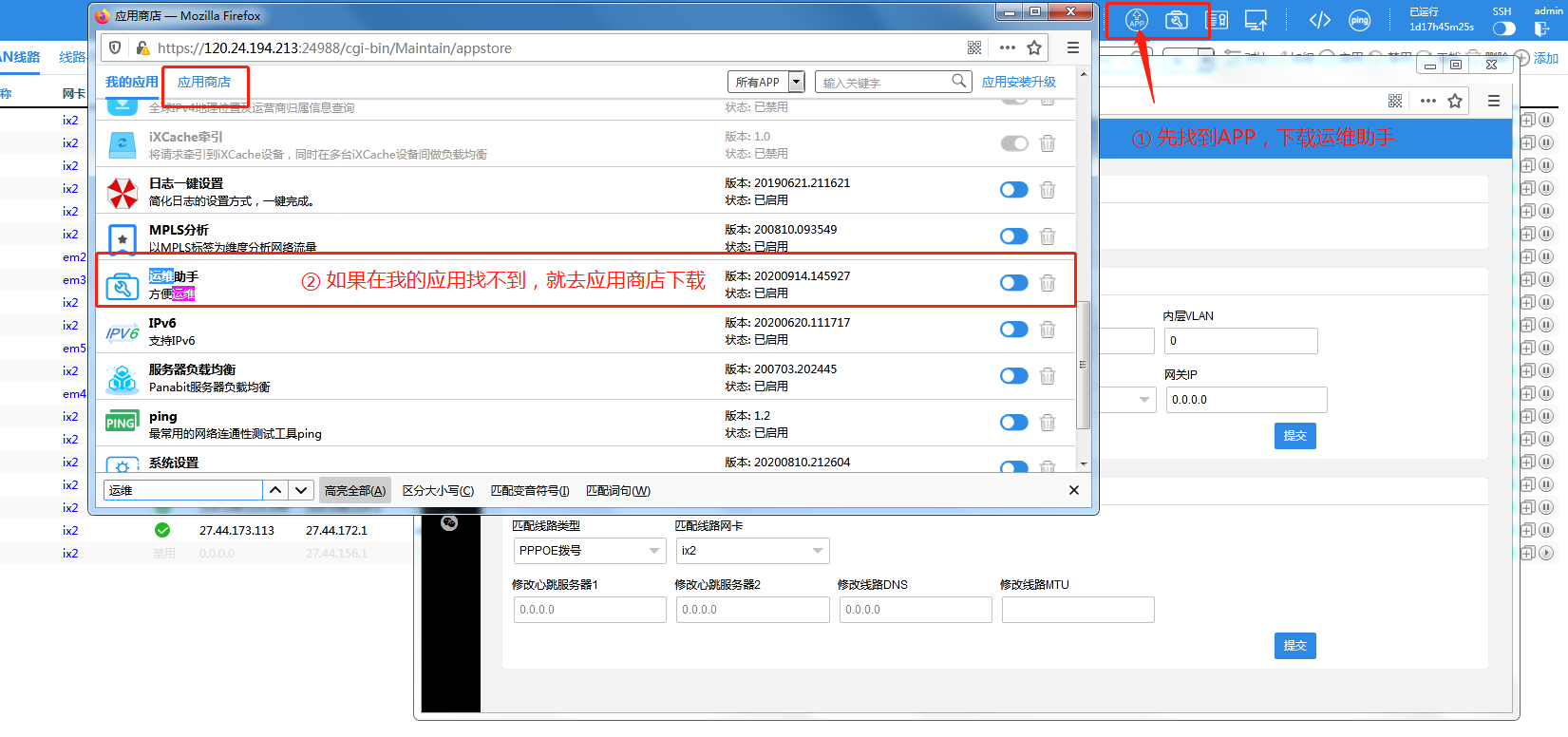 目录 搜索 Panabit一,快速判断WAN口是否异常丢包二,PING用户的延时教程三,派网内网环境下访问外网光猫四,添加外线教程五,连接数控制六,流量控制七,绑定单用户指定外线八,客户拨号718和691报错处理九,添加端口映射与DDNS十,panabit运维助手十一,pa网对接日志教程十二,pa网对接缓存ixcache教程十三,拦截电信运营商弹窗十四,地址池定时踢客户下线十五、自定义域名指定线路出口华为OLT一,备份华为OLT配置文件数据二,华为OLT一些相关命令三,光衰值分光说明华为网管U2000U2000网页界面相关操作运维助手奇妙之处一、批量添加外线增加心跳,判断资源故障二、系统体检【检测系统时间补漏洞】三、ping检测【判断资源延迟状态】 暂无相关搜索结果! 本文档由 智慧光迅 发布 一、批量添加外线增加心跳,判断资源故障 1:下载运维助手,并打开2:找到线路操作,批量针对外线指定需求的线路添加心跳IP,114.114.114.114, 223.5.5.5,MTU可以考虑修改14803:通过加了心跳后,发现很多外线资源有故障,将其禁用!!《PS:可以排序》4:搜索down的线路,将其禁用!!1:下载运维助手,并打开2:找到线路操作,批量针对外线指定需求的线路添加心跳IP,114.114.114.114, 223.5.5.5,MTU可以考虑修改14803:通过加了心跳后,发现很多外线资源有故障,将其禁用!!《PS:可以排序》4:搜索down的线路,将其禁用!!文档更新时间: 2020-12-02 14:54 作者:admin