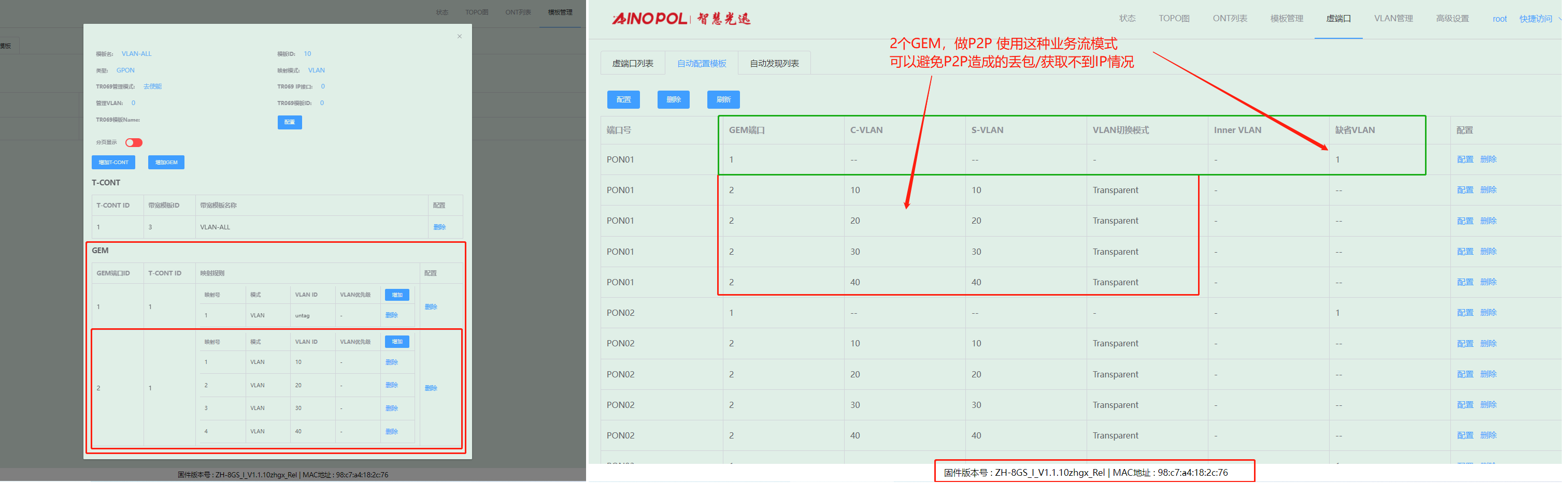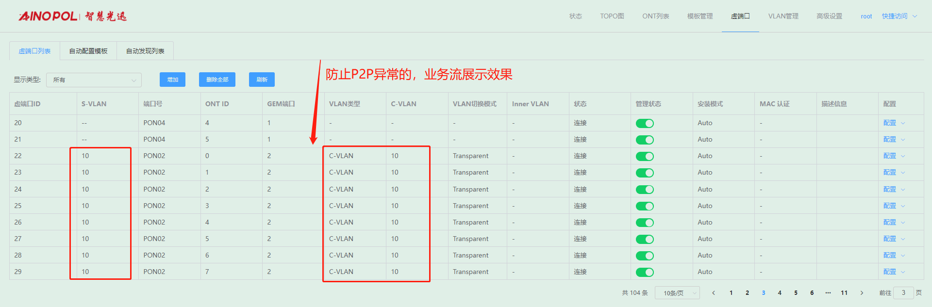 采用P2P模式:【推荐需要P2P的采用此方式】重点情况,需要做P2P,PON取消隔离,需要内网互通的(OLT-VLAN模式为: Transparent )需要想做2个GEM,且开启P2P的情况下,保证业务正常需要业务流像我这样操作! ( 无敌操作,保证无敌!)采用P2P模式:【推荐需要P2P的采用此方式】重点情况,需要做P2P,PON取消隔离,需要内网互通的(OLT-VLAN模式为: Transparent )需要想做2个GEM,且开启P2P的情况下,保证业务正常需要业务流像我这样操作! ( 无敌操作,保证无敌!)文档更新时间: 2024-10-19 09:49 作者:admin