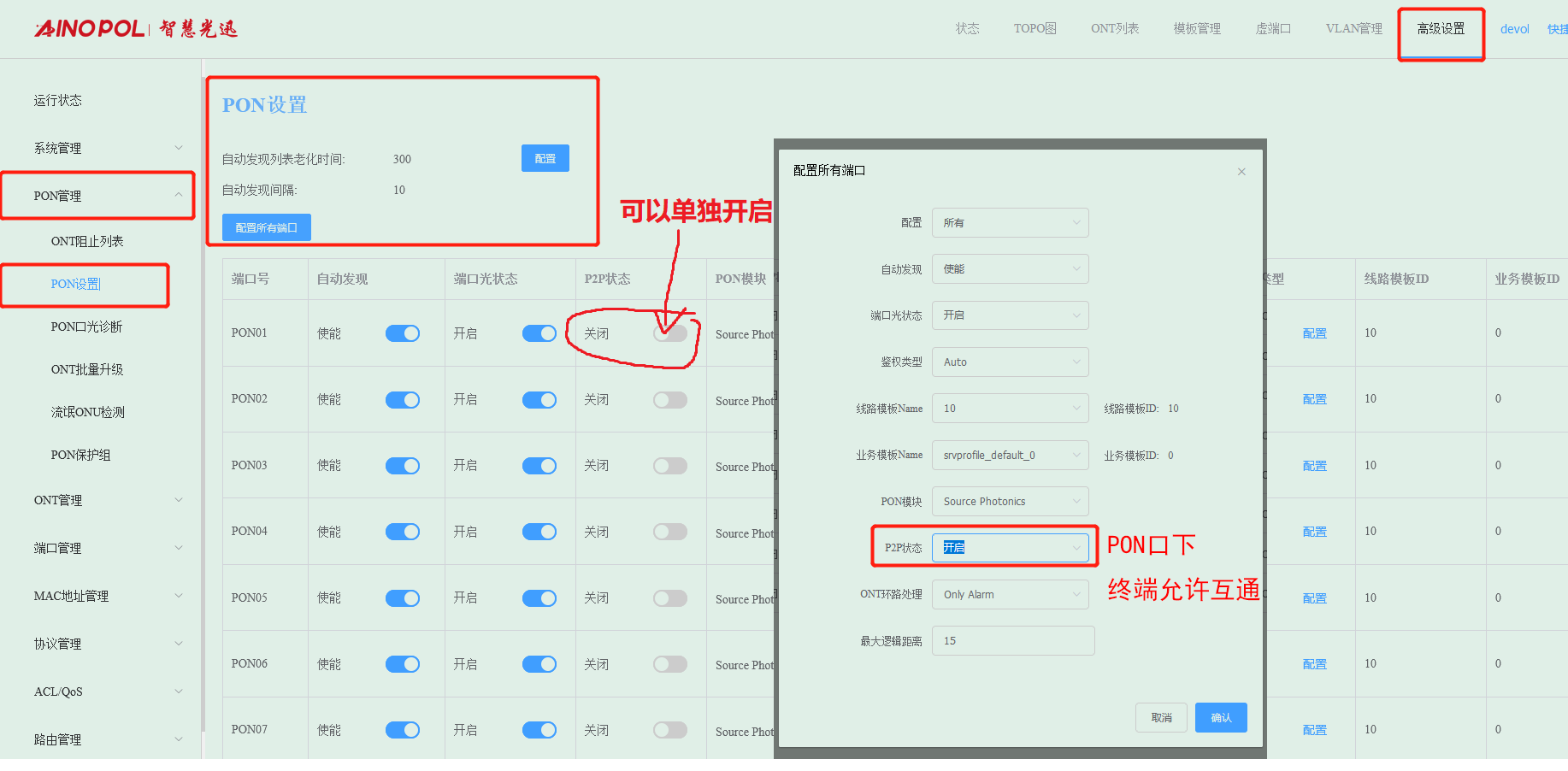 1:自动注册光猫上,需要开启 PON口对应的P2P