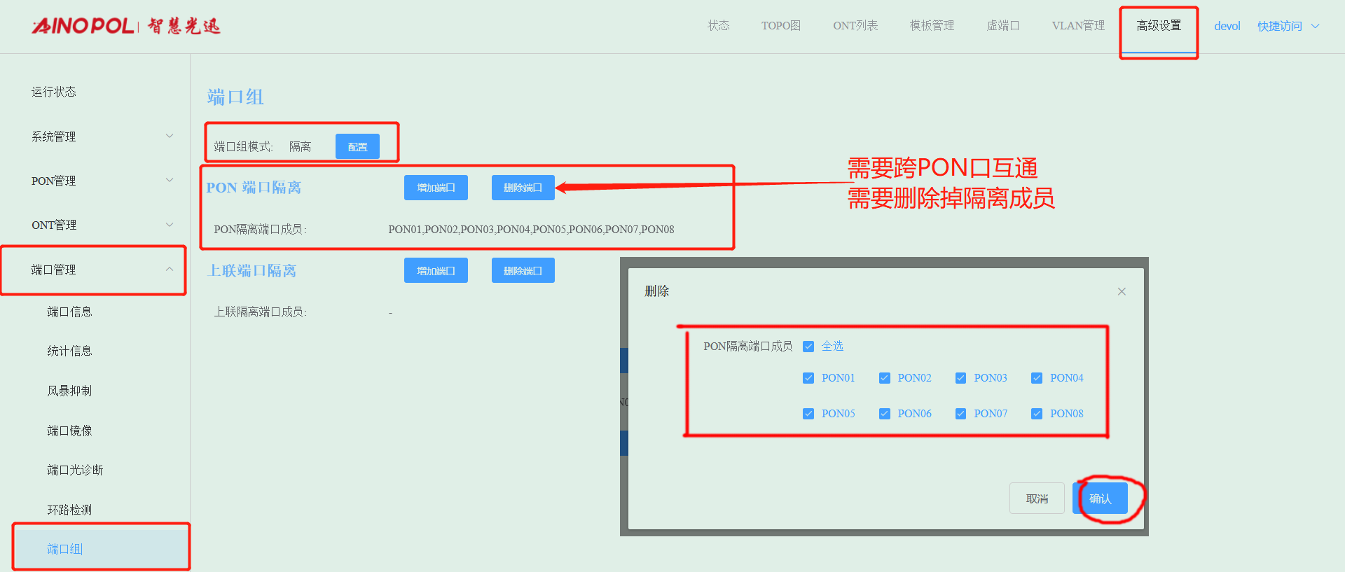 2:默认PON口是隔离模式,需要跨PON口通信 ,需要取消 PON隔离