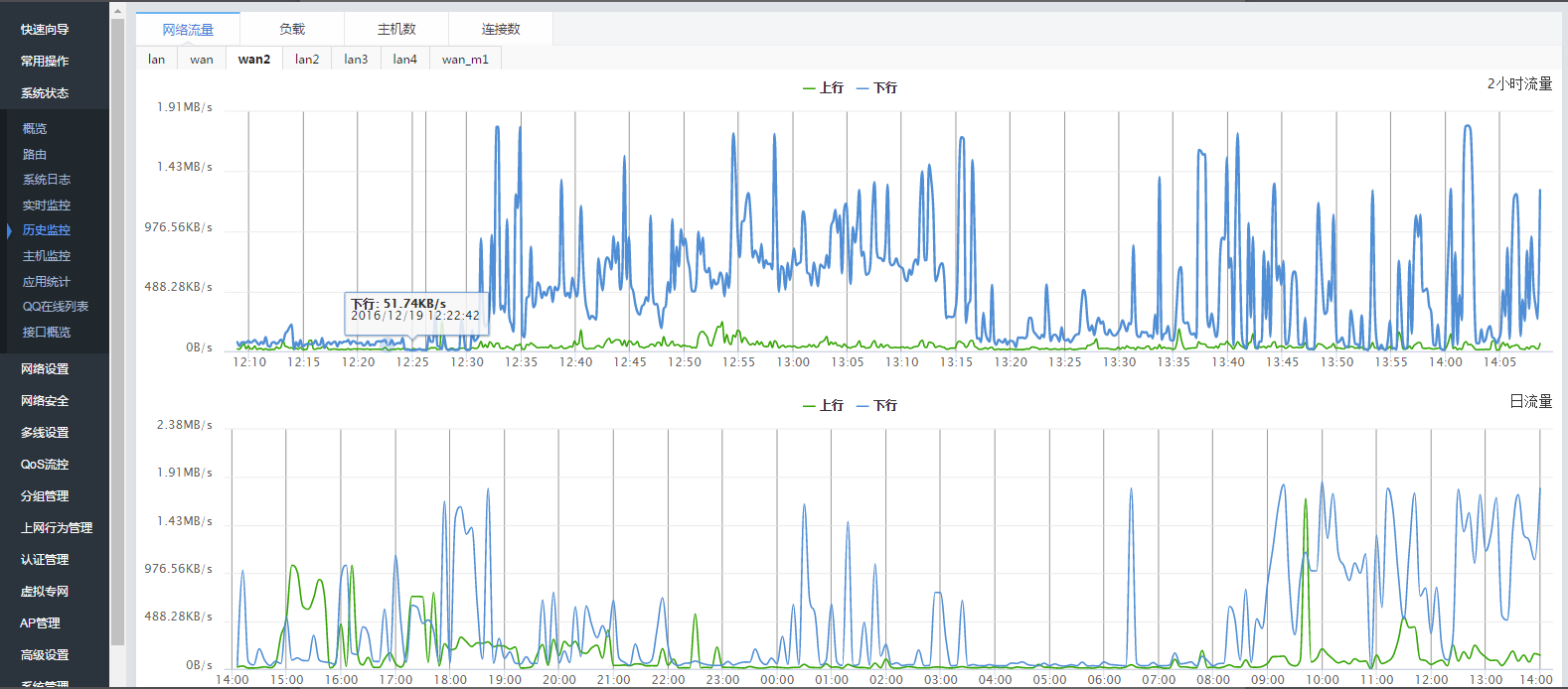目录 搜索 目录介绍AC路由对接凌风计费第三方Potal认证一,快速配置上网教程1.1 配置认证弹窗(一键认证)1.2 设置自动重播外线1.3 常用限速,匹配IP地址1.4 流控AC双机热备1.5 流控AC双机热备(简易版)二,设置向导2.1 快速向导2.2 专家向导三,系统状态3.1 概览3.2 路由3.3 实时监控3.4 历史监控3.5 主机监控3.6 应用统计3.7 QQ在线列表3.8 接口概览四,常用操作4.1 Qos流控4.2 内网配置4.3 DHCP4.4 路由密码4.5 端口映射4.6 外网配置4.7 多线策略4.8 ARP绑定五,网络设置5.1 接口概览5.2 外网配置5.3 内网配置5.4 DHCP5.5 DNS5.6 主机名5.7 静态路由5.8 动态域名六,多线设置6.1 多线策略6.2 单线多拨6.3 WAN口扩展七,Qos流控7.1 智能流控7.2 固定流控八,网络安全8.1 ARP绑定8.2 ARP安全8.3 ARP信任8.4 MAC过滤8.5 端口映射8.6 连接数限制8.7 DDos攻击防御九,分组管理9.1 IP组9.2 时间组9.3 端口组9.4 应用组9.5 MAC组9.6 域名组十,行为管理10.1 一键管控10.2 QQ在线列表10.3 QQ白名单10.4 网址过滤10.5 防火墙规则10.6 URL重定向10.7 WEB访问记录10.8 DNS过滤十一,虚拟专网11.1 PPTP服务器11.2 PPTP客户端11.3 L2TP服务器11.4 L2TP客户端11.5 IPSec十二,认证管理12.1 PPPoE服务器12.2 RADIUS设置12.3 账号管理12.4 用户列表12.5 消息推送十三,AP管理13.1 基础设置13.2 高级设置13.3 设备管理13.4 监控统计十四,高级设置14.1 接口高级设置14.2 接口设置14.3 防二级路由14.4 共享破解14.5 UPNP14.6 VLAN14.7 弹性端口14.8 UDP广播中继14.9 PPPoE中继14.10 接口绑定14.11 端口镜像十五,系统管理15.1 系统设置15.2 路由密码15.3 加入云端15.4 定时任务15.5 新系统诊断15.6 配置导入导出15.7 恢复出厂配置15.8 WEB访问管理15.9 特征库管理15.10 固件升级15.11 重启十六,系统工具16.1 诊断工具16.2 长Ping16.3 一键测速16.4 清理连接 暂无相关搜索结果! 本文档由 智慧光迅 发布 3.4 历史监控 历史监控历史监控● 历史监控:基于【实时监控】,记录小时、日、周、月的网络情况以及在线主机情况文档更新时间: 2020-02-22 16:55 作者:admin
