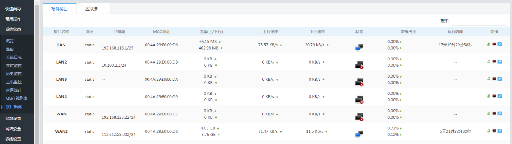 接口概览1、硬件接口2、虚拟接口接口概览显示路由器所有接口的状态,连接方式,带宽,网卡利用率等信息。1、硬件接口显示广域网,局域网等硬件接口相关信息。 在最右边一列为“动作”, 点击编辑, 可以对接口参数进行编辑。 点击“连接”可以重连接口, 比如重新拨号。 点击关闭, 可以暂时不用某个接口。2、虚拟接口显示设备的虚拟多wan接口相关信息主要显示WAN口扩展的虚拟接口以及单线多拨虚拟接口, 此处为虚拟接口参数配置的唯一入口。文档更新时间: 2020-02-22 16:56 作者:admin