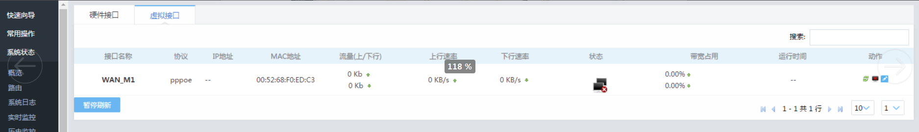 接口概览1、硬件接口2、虚拟接口接口概览显示路由器所有接口的状态,连接方式,带宽,网卡利用率等信息。1、硬件接口显示广域网,局域网等硬件接口相关信息。在最右边一列为“动作”, 点击编辑, 可以对接口参数进行编辑。 点击“连接”可以重连接口, 比如重新拨号。 点击关闭, 可以暂时不用某个接口。2、虚拟接口显示设备的虚拟多wan接口相关信息主要显示WAN口扩展的虚拟接口以及单线多拨虚拟接口, 此处为虚拟接口参数配置的唯一入口。文档更新时间: 2020-02-25 15:02 作者:admin