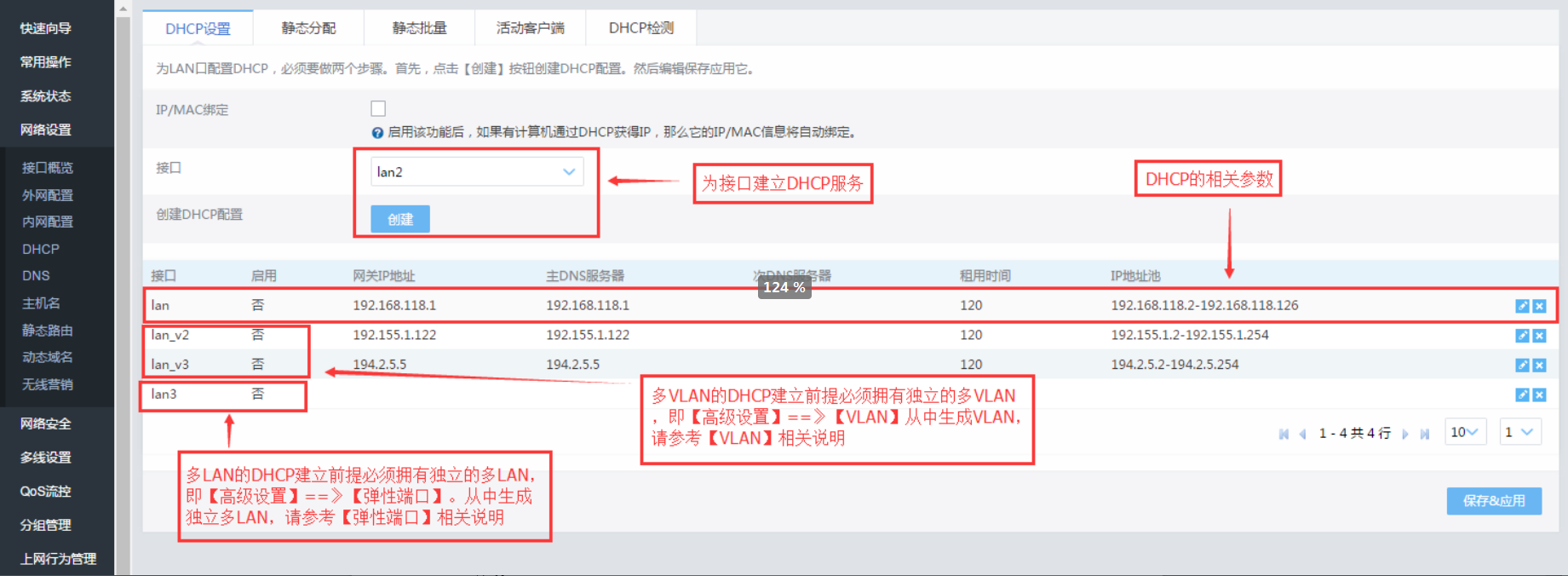 4.多LAN扩展DHCP建立前提是必须拥有独立的多LAN,即【高级设置】==》【弹性端口】,从中生成独立多LAN, 请参考【弹性端口】相关说明