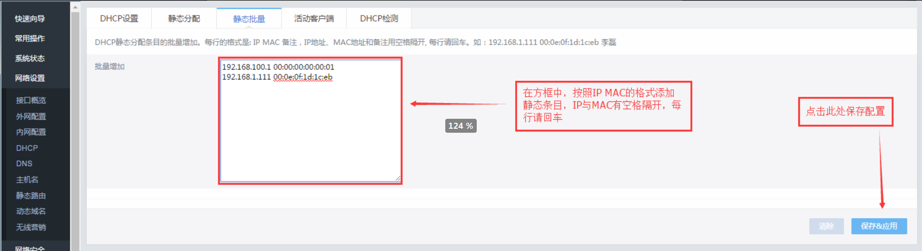 DHCP静态分配条目的批量增加。每行的格式是: IP MAC,IP地址和MAC地址用空格隔开, 每行请回车。如:192.168.1.111 00:0e:0f:1d:1c:eb