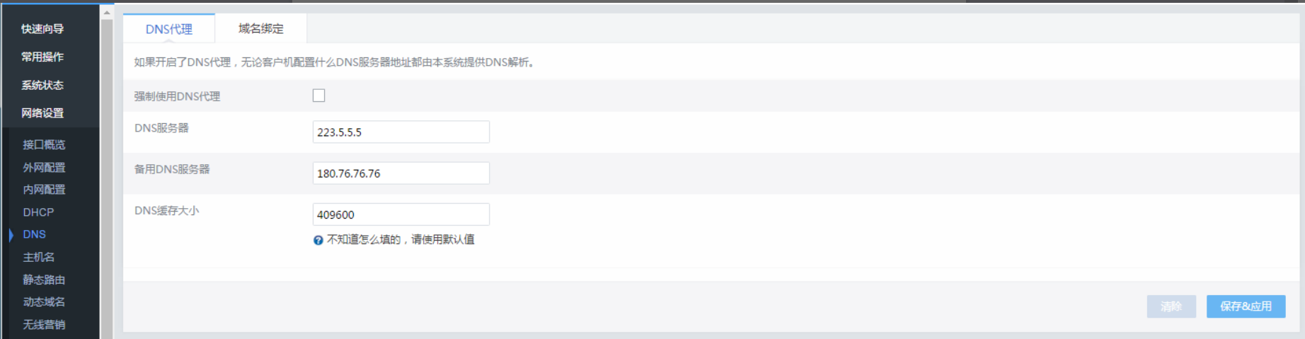 目录 搜索 目录介绍AC路由对接凌风计费第三方Potal认证一,快速配置上网教程1.1 配置认证弹窗(一键认证)1.2 设置自动重播外线1.3 常用限速,匹配IP地址1.4 流控AC双机热备1.5 流控AC双机热备(简易版)二,设置向导2.1 快速向导2.2 专家向导三,系统状态3.1 概览3.2 路由3.3 实时监控3.4 历史监控3.5 主机监控3.6 应用统计3.7 QQ在线列表3.8 接口概览四,常用操作4.1 Qos流控4.2 内网配置4.3 DHCP4.4 路由密码4.5 端口映射4.6 外网配置4.7 多线策略4.8 ARP绑定五,网络设置5.1 接口概览5.2 外网配置5.3 内网配置5.4 DHCP5.5 DNS5.6 主机名5.7 静态路由5.8 动态域名六,多线设置6.1 多线策略6.2 单线多拨6.3 WAN口扩展七,Qos流控7.1 智能流控7.2 固定流控八,网络安全8.1 ARP绑定8.2 ARP安全8.3 ARP信任8.4 MAC过滤8.5 端口映射8.6 连接数限制8.7 DDos攻击防御九,分组管理9.1 IP组9.2 时间组9.3 端口组9.4 应用组9.5 MAC组9.6 域名组十,行为管理10.1 一键管控10.2 QQ在线列表10.3 QQ白名单10.4 网址过滤10.5 防火墙规则10.6 URL重定向10.7 WEB访问记录10.8 DNS过滤十一,虚拟专网11.1 PPTP服务器11.2 PPTP客户端11.3 L2TP服务器11.4 L2TP客户端11.5 IPSec十二,认证管理12.1 PPPoE服务器12.2 RADIUS设置12.3 账号管理12.4 用户列表12.5 消息推送十三,AP管理13.1 基础设置13.2 高级设置13.3 设备管理13.4 监控统计十四,高级设置14.1 接口高级设置14.2 接口设置14.3 防二级路由14.4 共享破解14.5 UPNP14.6 VLAN14.7 弹性端口14.8 UDP广播中继14.9 PPPoE中继14.10 接口绑定14.11 端口镜像十五,系统管理15.1 系统设置15.2 路由密码15.3 加入云端15.4 定时任务15.5 新系统诊断15.6 配置导入导出15.7 恢复出厂配置15.8 WEB访问管理15.9 特征库管理15.10 固件升级15.11 重启十六,系统工具16.1 诊断工具16.2 长Ping16.3 一键测速16.4 清理连接 暂无相关搜索结果! 本文档由 智慧光迅 发布 5.5 DNS DNS1、DNS代理2、域名绑定DNS1、DNS代理强制对内网用户的DNS请求进行代理,无论客户机配置什么DNS服务器地址都由本系统提供DNS解析。注意: 网吧在多线的情况下不建议使用DNS代理,会影响应用分流的准确性2、域名绑定将域名绑定到指定的DNS去进行解析文档更新时间: 2020-02-25 15:14 作者:admin