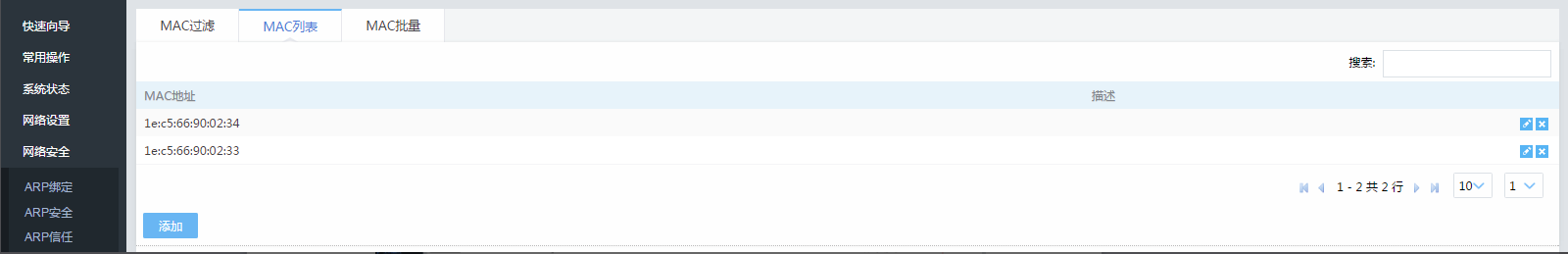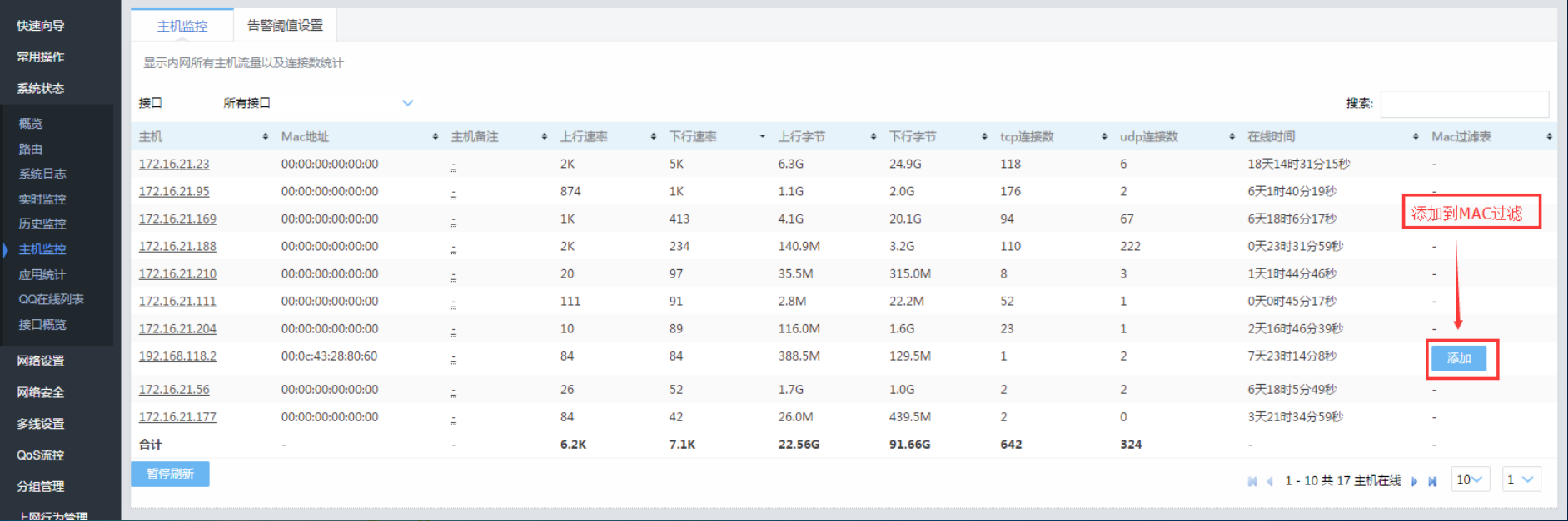MAC过滤MAC过滤 通过MAC过滤对局域网内的主机访问Internet进行控制,MAC过滤:禁止或者允许【MAC列表】内的用户访问internet,MAC列表:用于MAC过滤的访问列表,可以直接在【主机监控】里加入,也可手动添加MAC批量:小技巧: 此处也可以用作“批量导出”, Ctrl+A, 选中编辑框中所有条目, 然后使用CTRL+C以及CTRL+V 可以完整导出到任意文本文件。文档更新时间: 2020-02-25 13:55 作者:admin