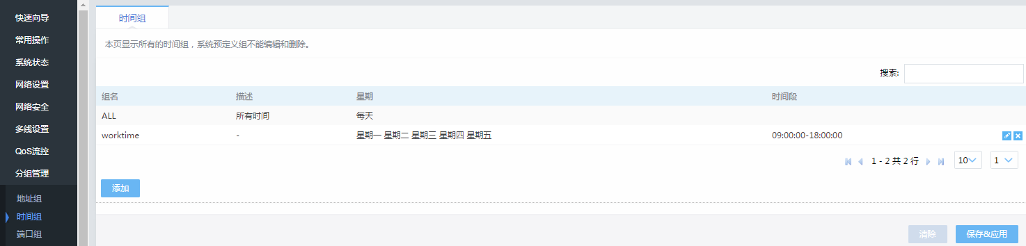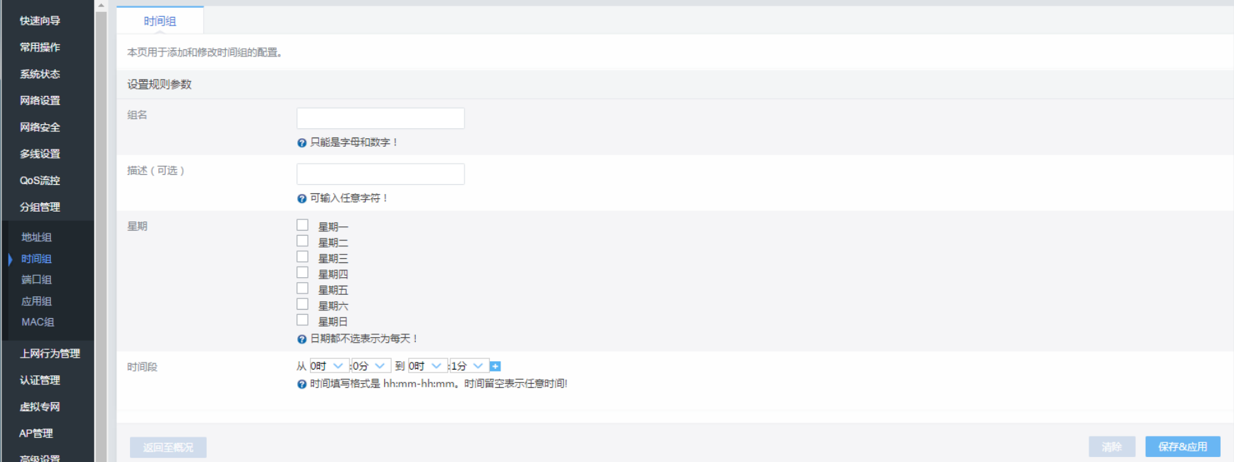 目录 搜索 目录介绍AC路由对接凌风计费第三方Potal认证一,快速配置上网教程1.1 配置认证弹窗(一键认证)1.2 设置自动重播外线1.3 常用限速,匹配IP地址1.4 流控AC双机热备1.5 流控AC双机热备(简易版)二,设置向导2.1 快速向导2.2 专家向导三,系统状态3.1 概览3.2 路由3.3 实时监控3.4 历史监控3.5 主机监控3.6 应用统计3.7 QQ在线列表3.8 接口概览四,常用操作4.1 Qos流控4.2 内网配置4.3 DHCP4.4 路由密码4.5 端口映射4.6 外网配置4.7 多线策略4.8 ARP绑定五,网络设置5.1 接口概览5.2 外网配置5.3 内网配置5.4 DHCP5.5 DNS5.6 主机名5.7 静态路由5.8 动态域名六,多线设置6.1 多线策略6.2 单线多拨6.3 WAN口扩展七,Qos流控7.1 智能流控7.2 固定流控八,网络安全8.1 ARP绑定8.2 ARP安全8.3 ARP信任8.4 MAC过滤8.5 端口映射8.6 连接数限制8.7 DDos攻击防御九,分组管理9.1 IP组9.2 时间组9.3 端口组9.4 应用组9.5 MAC组9.6 域名组十,行为管理10.1 一键管控10.2 QQ在线列表10.3 QQ白名单10.4 网址过滤10.5 防火墙规则10.6 URL重定向10.7 WEB访问记录10.8 DNS过滤十一,虚拟专网11.1 PPTP服务器11.2 PPTP客户端11.3 L2TP服务器11.4 L2TP客户端11.5 IPSec十二,认证管理12.1 PPPoE服务器12.2 RADIUS设置12.3 账号管理12.4 用户列表12.5 消息推送十三,AP管理13.1 基础设置13.2 高级设置13.3 设备管理13.4 监控统计十四,高级设置14.1 接口高级设置14.2 接口设置14.3 防二级路由14.4 共享破解14.5 UPNP14.6 VLAN14.7 弹性端口14.8 UDP广播中继14.9 PPPoE中继14.10 接口绑定14.11 端口镜像十五,系统管理15.1 系统设置15.2 路由密码15.3 加入云端15.4 定时任务15.5 新系统诊断15.6 配置导入导出15.7 恢复出厂配置15.8 WEB访问管理15.9 特征库管理15.10 固件升级15.11 重启十六,系统工具16.1 诊断工具16.2 长Ping16.3 一键测速16.4 清理连接 暂无相关搜索结果! 本文档由 智慧光迅 发布 9.2 时间组 时间组时间组本页显示所有的时间组,系统预定义组-“ALL”不能编辑和删除,点击“添加”或“修改”可进行相关时间组设置。文档更新时间: 2020-02-25 13:55 作者:admin