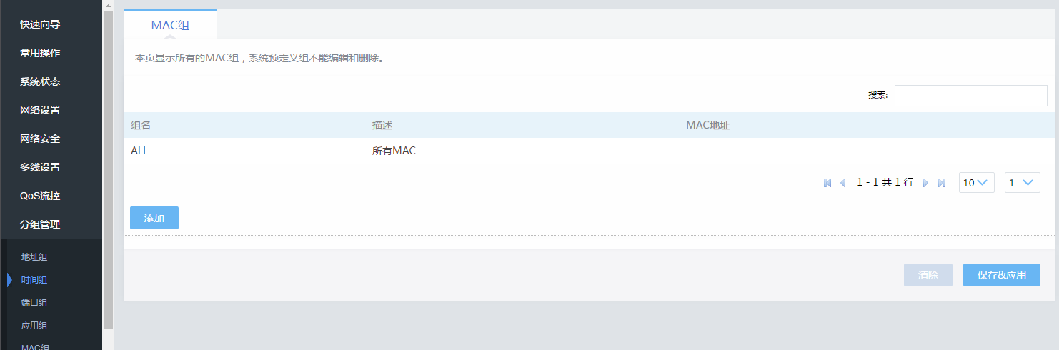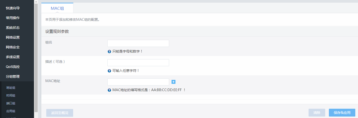 目录 搜索 目录介绍AC路由对接凌风计费第三方Potal认证一,快速配置上网教程1.1 配置认证弹窗(一键认证)1.2 设置自动重播外线1.3 常用限速,匹配IP地址1.4 流控AC双机热备1.5 流控AC双机热备(简易版)二,设置向导2.1 快速向导2.2 专家向导三,系统状态3.1 概览3.2 路由3.3 实时监控3.4 历史监控3.5 主机监控3.6 应用统计3.7 QQ在线列表3.8 接口概览四,常用操作4.1 Qos流控4.2 内网配置4.3 DHCP4.4 路由密码4.5 端口映射4.6 外网配置4.7 多线策略4.8 ARP绑定五,网络设置5.1 接口概览5.2 外网配置5.3 内网配置5.4 DHCP5.5 DNS5.6 主机名5.7 静态路由5.8 动态域名六,多线设置6.1 多线策略6.2 单线多拨6.3 WAN口扩展七,Qos流控7.1 智能流控7.2 固定流控八,网络安全8.1 ARP绑定8.2 ARP安全8.3 ARP信任8.4 MAC过滤8.5 端口映射8.6 连接数限制8.7 DDos攻击防御九,分组管理9.1 IP组9.2 时间组9.3 端口组9.4 应用组9.5 MAC组9.6 域名组十,行为管理10.1 一键管控10.2 QQ在线列表10.3 QQ白名单10.4 网址过滤10.5 防火墙规则10.6 URL重定向10.7 WEB访问记录10.8 DNS过滤十一,虚拟专网11.1 PPTP服务器11.2 PPTP客户端11.3 L2TP服务器11.4 L2TP客户端11.5 IPSec十二,认证管理12.1 PPPoE服务器12.2 RADIUS设置12.3 账号管理12.4 用户列表12.5 消息推送十三,AP管理13.1 基础设置13.2 高级设置13.3 设备管理13.4 监控统计十四,高级设置14.1 接口高级设置14.2 接口设置14.3 防二级路由14.4 共享破解14.5 UPNP14.6 VLAN14.7 弹性端口14.8 UDP广播中继14.9 PPPoE中继14.10 接口绑定14.11 端口镜像十五,系统管理15.1 系统设置15.2 路由密码15.3 加入云端15.4 定时任务15.5 新系统诊断15.6 配置导入导出15.7 恢复出厂配置15.8 WEB访问管理15.9 特征库管理15.10 固件升级15.11 重启十六,系统工具16.1 诊断工具16.2 长Ping16.3 一键测速16.4 清理连接 暂无相关搜索结果! 本文档由 智慧光迅 发布 9.5 MAC组 MAC组MAC组本页显示所有的MAAC组,系统预定义组-“ALL”不能编辑和删除,点击“添加”或“修改”进行MAC组相应设置。文档更新时间: 2020-02-25 13:56 作者:admin