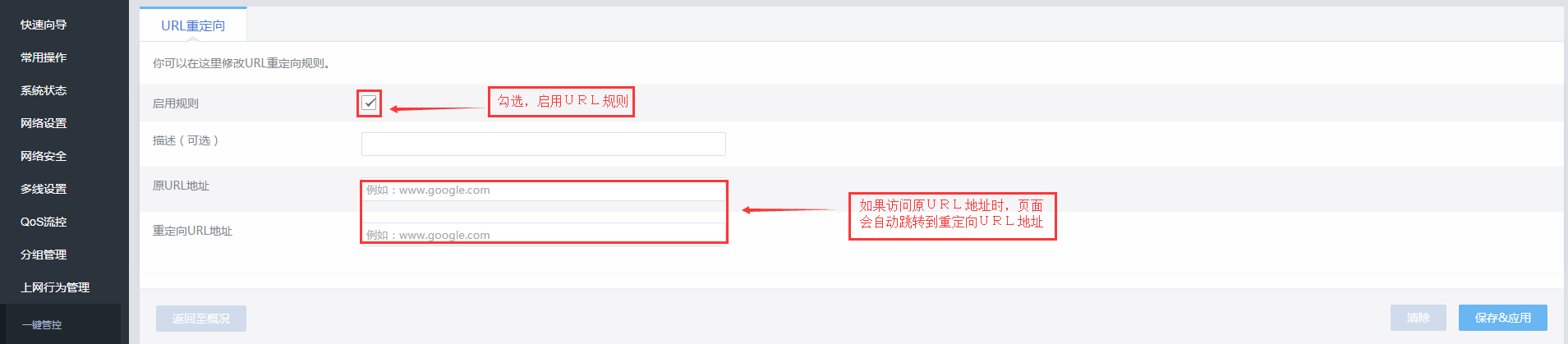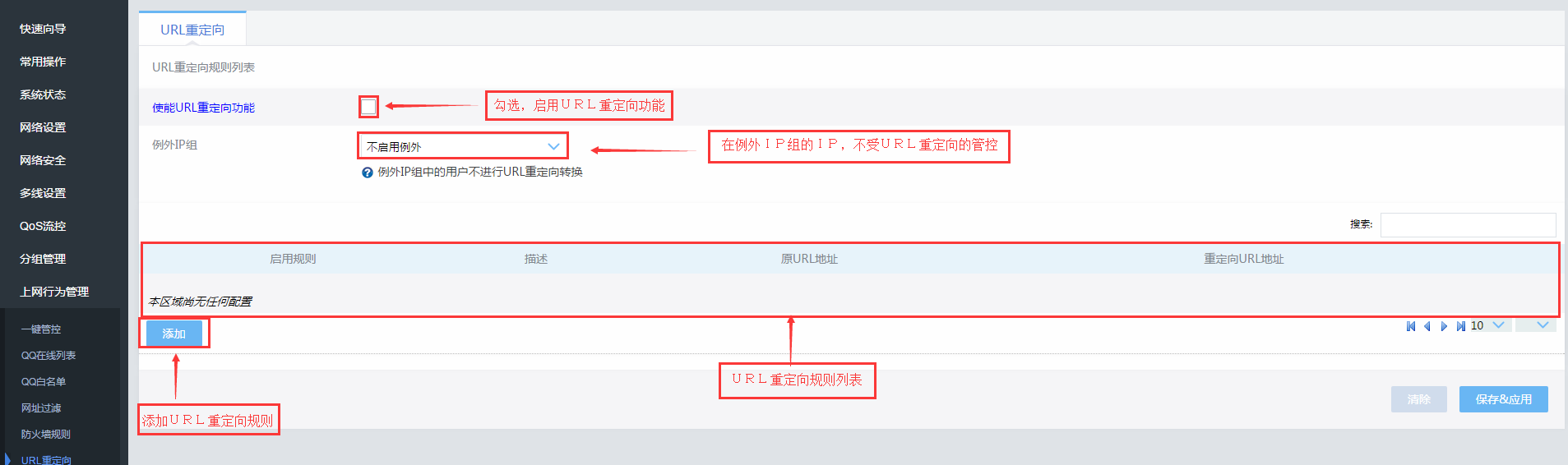 目录 搜索 目录介绍AC路由对接凌风计费第三方Potal认证一,快速配置上网教程1.1 配置认证弹窗(一键认证)1.2 设置自动重播外线1.3 常用限速,匹配IP地址1.4 流控AC双机热备1.5 流控AC双机热备(简易版)二,设置向导2.1 快速向导2.2 专家向导三,系统状态3.1 概览3.2 路由3.3 实时监控3.4 历史监控3.5 主机监控3.6 应用统计3.7 QQ在线列表3.8 接口概览四,常用操作4.1 Qos流控4.2 内网配置4.3 DHCP4.4 路由密码4.5 端口映射4.6 外网配置4.7 多线策略4.8 ARP绑定五,网络设置5.1 接口概览5.2 外网配置5.3 内网配置5.4 DHCP5.5 DNS5.6 主机名5.7 静态路由5.8 动态域名六,多线设置6.1 多线策略6.2 单线多拨6.3 WAN口扩展七,Qos流控7.1 智能流控7.2 固定流控八,网络安全8.1 ARP绑定8.2 ARP安全8.3 ARP信任8.4 MAC过滤8.5 端口映射8.6 连接数限制8.7 DDos攻击防御九,分组管理9.1 IP组9.2 时间组9.3 端口组9.4 应用组9.5 MAC组9.6 域名组十,行为管理10.1 一键管控10.2 QQ在线列表10.3 QQ白名单10.4 网址过滤10.5 防火墙规则10.6 URL重定向10.7 WEB访问记录10.8 DNS过滤十一,虚拟专网11.1 PPTP服务器11.2 PPTP客户端11.3 L2TP服务器11.4 L2TP客户端11.5 IPSec十二,认证管理12.1 PPPoE服务器12.2 RADIUS设置12.3 账号管理12.4 用户列表12.5 消息推送十三,AP管理13.1 基础设置13.2 高级设置13.3 设备管理13.4 监控统计十四,高级设置14.1 接口高级设置14.2 接口设置14.3 防二级路由14.4 共享破解14.5 UPNP14.6 VLAN14.7 弹性端口14.8 UDP广播中继14.9 PPPoE中继14.10 接口绑定14.11 端口镜像十五,系统管理15.1 系统设置15.2 路由密码15.3 加入云端15.4 定时任务15.5 新系统诊断15.6 配置导入导出15.7 恢复出厂配置15.8 WEB访问管理15.9 特征库管理15.10 固件升级15.11 重启十六,系统工具16.1 诊断工具16.2 长Ping16.3 一键测速16.4 清理连接 暂无相关搜索结果! 本文档由 智慧光迅 发布 10.6 URL重定向 URL重定向URL重定向URL重定向可以实现,如果主机访问某个网址时,将其导向另一个网址。文档更新时间: 2020-02-25 14:01 作者:admin