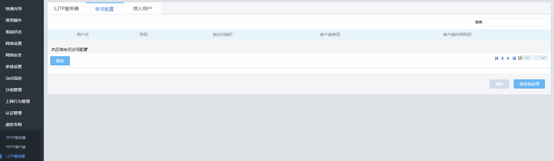 目录 搜索 目录介绍AC路由对接凌风计费第三方Potal认证一,快速配置上网教程1.1 配置认证弹窗(一键认证)1.2 设置自动重播外线1.3 常用限速,匹配IP地址1.4 流控AC双机热备1.5 流控AC双机热备(简易版)二,设置向导2.1 快速向导2.2 专家向导三,系统状态3.1 概览3.2 路由3.3 实时监控3.4 历史监控3.5 主机监控3.6 应用统计3.7 QQ在线列表3.8 接口概览四,常用操作4.1 Qos流控4.2 内网配置4.3 DHCP4.4 路由密码4.5 端口映射4.6 外网配置4.7 多线策略4.8 ARP绑定五,网络设置5.1 接口概览5.2 外网配置5.3 内网配置5.4 DHCP5.5 DNS5.6 主机名5.7 静态路由5.8 动态域名六,多线设置6.1 多线策略6.2 单线多拨6.3 WAN口扩展七,Qos流控7.1 智能流控7.2 固定流控八,网络安全8.1 ARP绑定8.2 ARP安全8.3 ARP信任8.4 MAC过滤8.5 端口映射8.6 连接数限制8.7 DDos攻击防御九,分组管理9.1 IP组9.2 时间组9.3 端口组9.4 应用组9.5 MAC组9.6 域名组十,行为管理10.1 一键管控10.2 QQ在线列表10.3 QQ白名单10.4 网址过滤10.5 防火墙规则10.6 URL重定向10.7 WEB访问记录10.8 DNS过滤十一,虚拟专网11.1 PPTP服务器11.2 PPTP客户端11.3 L2TP服务器11.4 L2TP客户端11.5 IPSec十二,认证管理12.1 PPPoE服务器12.2 RADIUS设置12.3 账号管理12.4 用户列表12.5 消息推送十三,AP管理13.1 基础设置13.2 高级设置13.3 设备管理13.4 监控统计十四,高级设置14.1 接口高级设置14.2 接口设置14.3 防二级路由14.4 共享破解14.5 UPNP14.6 VLAN14.7 弹性端口14.8 UDP广播中继14.9 PPPoE中继14.10 接口绑定14.11 端口镜像十五,系统管理15.1 系统设置15.2 路由密码15.3 加入云端15.4 定时任务15.5 新系统诊断15.6 配置导入导出15.7 恢复出厂配置15.8 WEB访问管理15.9 特征库管理15.10 固件升级15.11 重启十六,系统工具16.1 诊断工具16.2 长Ping16.3 一键测速16.4 清理连接 暂无相关搜索结果! 本文档由 智慧光迅 发布 11.3 L2TP服务器 L2TP服务器L2TP服务器L2TP(Layer 2 Tunneling Protocol,二层隧道协议)是VPDN(VirtualPrivate Dial-up Network,虚拟私有拨号网)隧道协议的一种。点击添加按钮来添加VPN账号和密码拨入用户可以显示当前已经通过L2TP拨入的用户账号文档更新时间: 2020-02-25 14:02 作者:admin