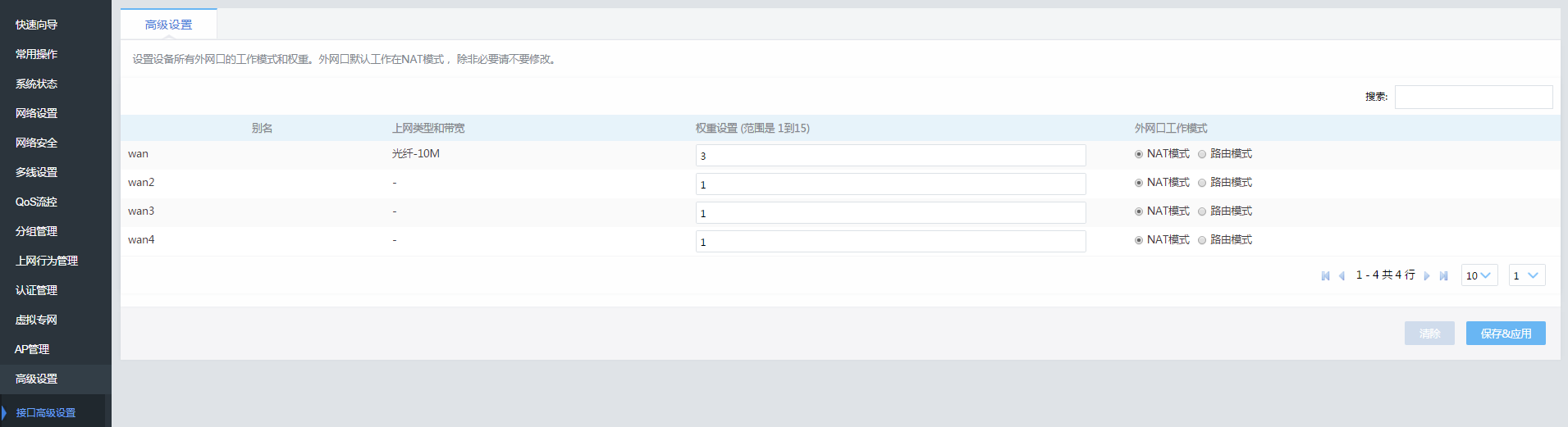 该页面可设置WAN口的权重(越大越优)和工作模式(一般默认为NAT模式)。