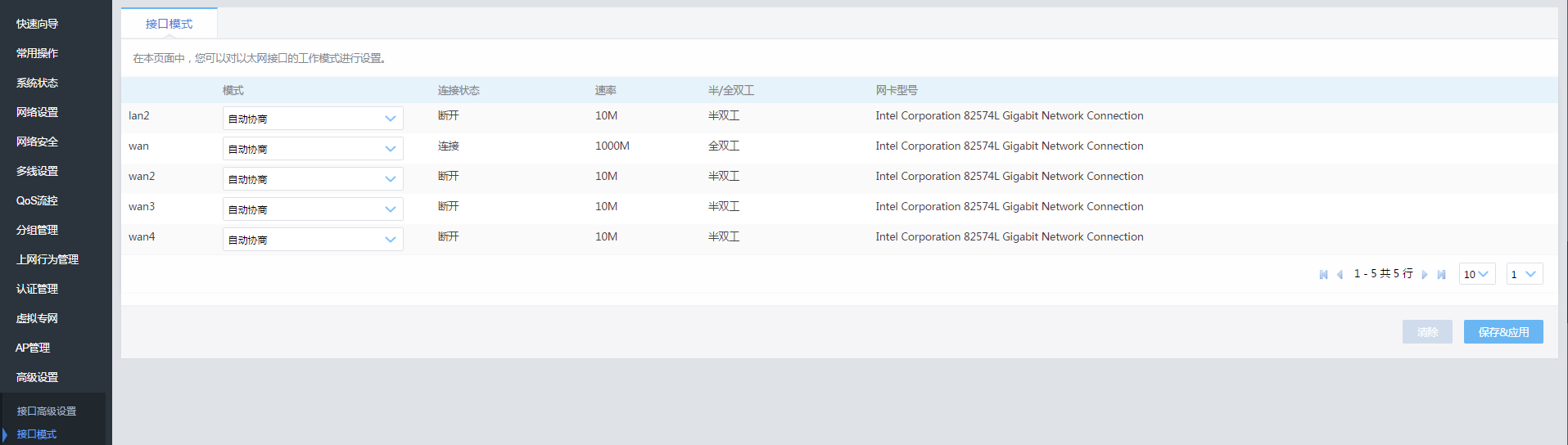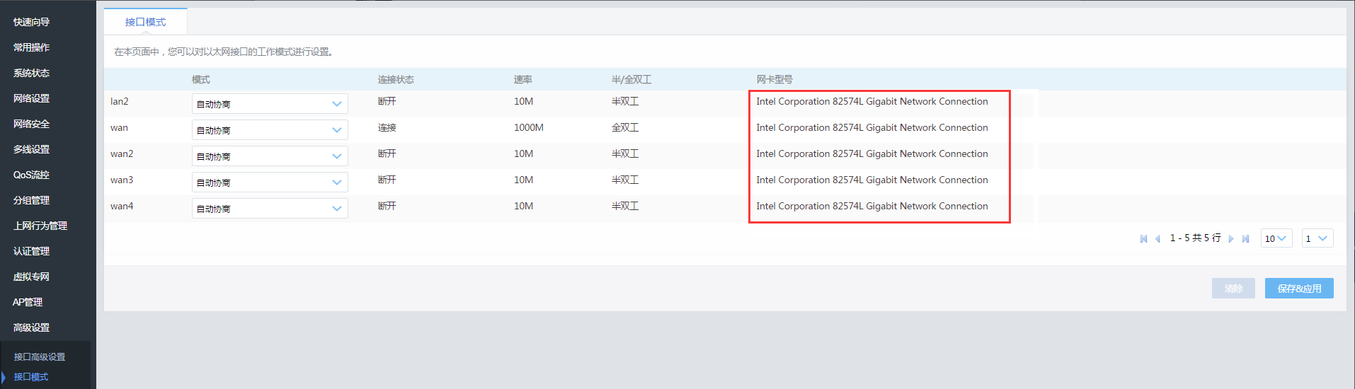接口模式接口模式在本页面中,您可以对以太网接口的工作模式进行设置。此处显示网口的网卡芯片类型, 如下图:可以帮助您判断外网接口通用名称WAN*所对应的网口。文档更新时间: 2020-02-25 14:53 作者:admin