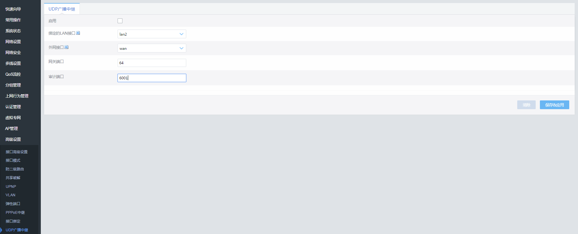 目录 搜索 目录介绍AC路由对接凌风计费第三方Potal认证一,快速配置上网教程1.1 配置认证弹窗(一键认证)1.2 设置自动重播外线1.3 常用限速,匹配IP地址1.4 流控AC双机热备1.5 流控AC双机热备(简易版)二,设置向导2.1 快速向导2.2 专家向导三,系统状态3.1 概览3.2 路由3.3 实时监控3.4 历史监控3.5 主机监控3.6 应用统计3.7 QQ在线列表3.8 接口概览四,常用操作4.1 Qos流控4.2 内网配置4.3 DHCP4.4 路由密码4.5 端口映射4.6 外网配置4.7 多线策略4.8 ARP绑定五,网络设置5.1 接口概览5.2 外网配置5.3 内网配置5.4 DHCP5.5 DNS5.6 主机名5.7 静态路由5.8 动态域名六,多线设置6.1 多线策略6.2 单线多拨6.3 WAN口扩展七,Qos流控7.1 智能流控7.2 固定流控八,网络安全8.1 ARP绑定8.2 ARP安全8.3 ARP信任8.4 MAC过滤8.5 端口映射8.6 连接数限制8.7 DDos攻击防御九,分组管理9.1 IP组9.2 时间组9.3 端口组9.4 应用组9.5 MAC组9.6 域名组十,行为管理10.1 一键管控10.2 QQ在线列表10.3 QQ白名单10.4 网址过滤10.5 防火墙规则10.6 URL重定向10.7 WEB访问记录10.8 DNS过滤十一,虚拟专网11.1 PPTP服务器11.2 PPTP客户端11.3 L2TP服务器11.4 L2TP客户端11.5 IPSec十二,认证管理12.1 PPPoE服务器12.2 RADIUS设置12.3 账号管理12.4 用户列表12.5 消息推送十三,AP管理13.1 基础设置13.2 高级设置13.3 设备管理13.4 监控统计十四,高级设置14.1 接口高级设置14.2 接口设置14.3 防二级路由14.4 共享破解14.5 UPNP14.6 VLAN14.7 弹性端口14.8 UDP广播中继14.9 PPPoE中继14.10 接口绑定14.11 端口镜像十五,系统管理15.1 系统设置15.2 路由密码15.3 加入云端15.4 定时任务15.5 新系统诊断15.6 配置导入导出15.7 恢复出厂配置15.8 WEB访问管理15.9 特征库管理15.10 固件升级15.11 重启十六,系统工具16.1 诊断工具16.2 长Ping16.3 一键测速16.4 清理连接 暂无相关搜索结果! 本文档由 智慧光迅 发布 14.8 UDP广播中继 UDP广播包中继UDP广播包中继将内网的udp广播包,通过我们的设备可以转发出去,让二级设备透传到出去。文档更新时间: 2020-02-29 13:45 作者:admin