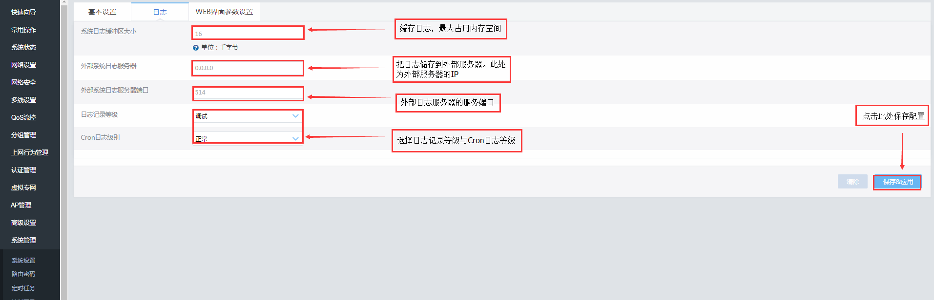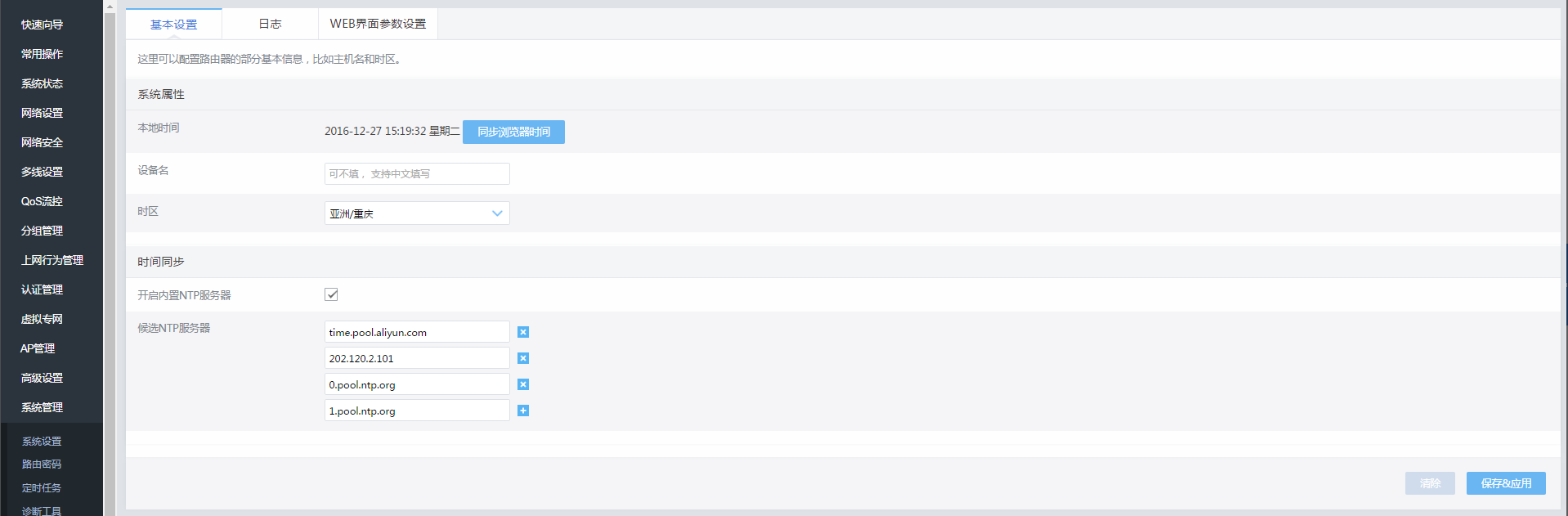 目录 搜索 目录介绍AC路由对接凌风计费第三方Potal认证一,快速配置上网教程1.1 配置认证弹窗(一键认证)1.2 设置自动重播外线1.3 常用限速,匹配IP地址1.4 流控AC双机热备1.5 流控AC双机热备(简易版)二,设置向导2.1 快速向导2.2 专家向导三,系统状态3.1 概览3.2 路由3.3 实时监控3.4 历史监控3.5 主机监控3.6 应用统计3.7 QQ在线列表3.8 接口概览四,常用操作4.1 Qos流控4.2 内网配置4.3 DHCP4.4 路由密码4.5 端口映射4.6 外网配置4.7 多线策略4.8 ARP绑定五,网络设置5.1 接口概览5.2 外网配置5.3 内网配置5.4 DHCP5.5 DNS5.6 主机名5.7 静态路由5.8 动态域名六,多线设置6.1 多线策略6.2 单线多拨6.3 WAN口扩展七,Qos流控7.1 智能流控7.2 固定流控八,网络安全8.1 ARP绑定8.2 ARP安全8.3 ARP信任8.4 MAC过滤8.5 端口映射8.6 连接数限制8.7 DDos攻击防御九,分组管理9.1 IP组9.2 时间组9.3 端口组9.4 应用组9.5 MAC组9.6 域名组十,行为管理10.1 一键管控10.2 QQ在线列表10.3 QQ白名单10.4 网址过滤10.5 防火墙规则10.6 URL重定向10.7 WEB访问记录10.8 DNS过滤十一,虚拟专网11.1 PPTP服务器11.2 PPTP客户端11.3 L2TP服务器11.4 L2TP客户端11.5 IPSec十二,认证管理12.1 PPPoE服务器12.2 RADIUS设置12.3 账号管理12.4 用户列表12.5 消息推送十三,AP管理13.1 基础设置13.2 高级设置13.3 设备管理13.4 监控统计十四,高级设置14.1 接口高级设置14.2 接口设置14.3 防二级路由14.4 共享破解14.5 UPNP14.6 VLAN14.7 弹性端口14.8 UDP广播中继14.9 PPPoE中继14.10 接口绑定14.11 端口镜像十五,系统管理15.1 系统设置15.2 路由密码15.3 加入云端15.4 定时任务15.5 新系统诊断15.6 配置导入导出15.7 恢复出厂配置15.8 WEB访问管理15.9 特征库管理15.10 固件升级15.11 重启十六,系统工具16.1 诊断工具16.2 长Ping16.3 一键测速16.4 清理连接 暂无相关搜索结果! 本文档由 智慧光迅 发布 15.1 系统设置 系统设置1、基本设置2、日志3、Web界面参数设置系统设置这里可以配置路由器的部分基本信息,比如主机名和时区。1、基本设置设备名修改后, 会显示在首页【系统状态】→【概览】的右上角2、日志日志有利我们查看路由器的工作状态的历史记录,了解路由器的健康状态。3、Web界面参数设置勾选启用了“基于接口的应用统计”后, 在【系统状态】—》【应用统计】会出现接口选项, 如下图:文档更新时间: 2020-02-25 15:18 作者:admin