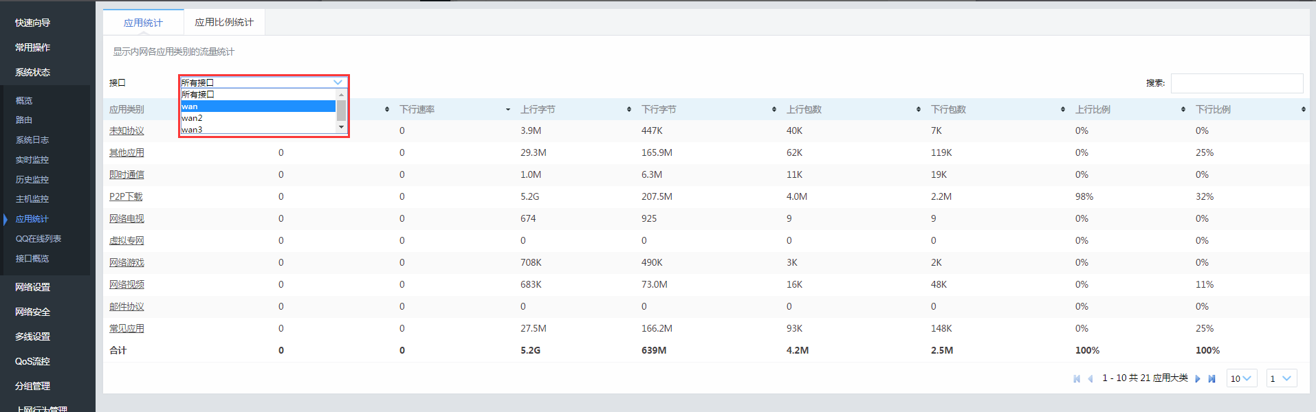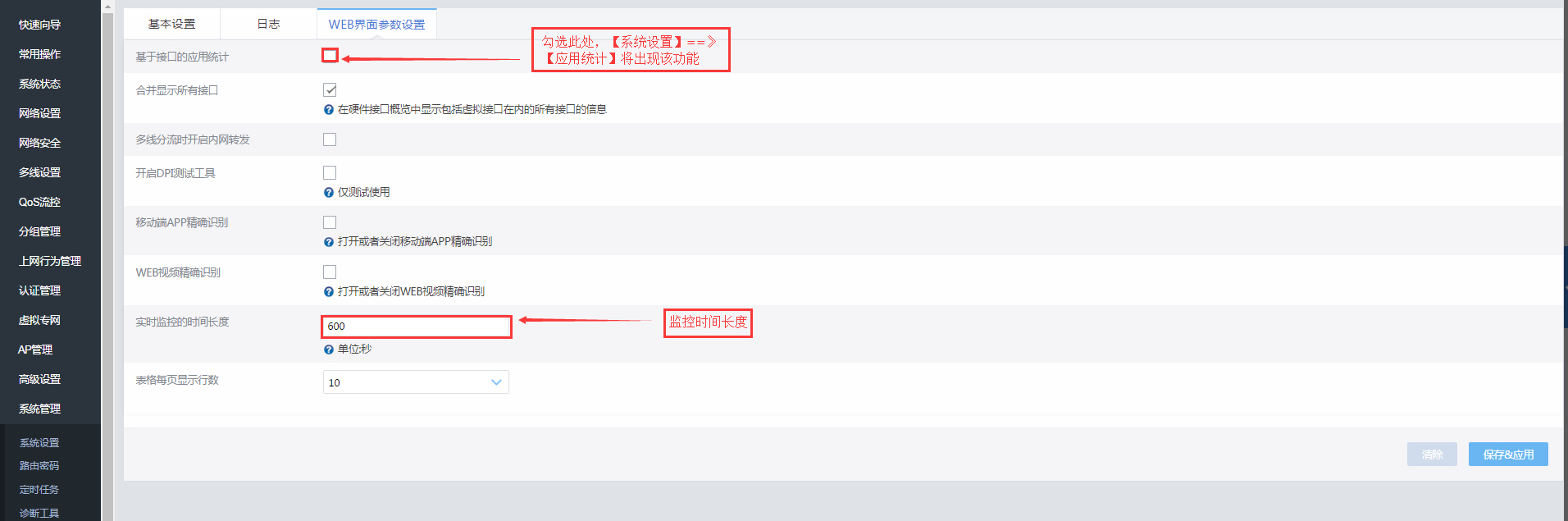 系统设置1、基本设置2、日志3、Web界面参数设置系统设置这里可以配置路由器的部分基本信息,比如主机名和时区。1、基本设置设备名修改后, 会显示在首页【系统状态】→【概览】的右上角2、日志日志有利我们查看路由器的工作状态的历史记录,了解路由器的健康状态。3、Web界面参数设置勾选启用了“基于接口的应用统计”后, 在【系统状态】—》【应用统计】会出现接口选项, 如下图:文档更新时间: 2020-02-25 15:18 作者:admin