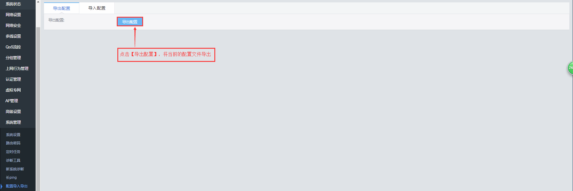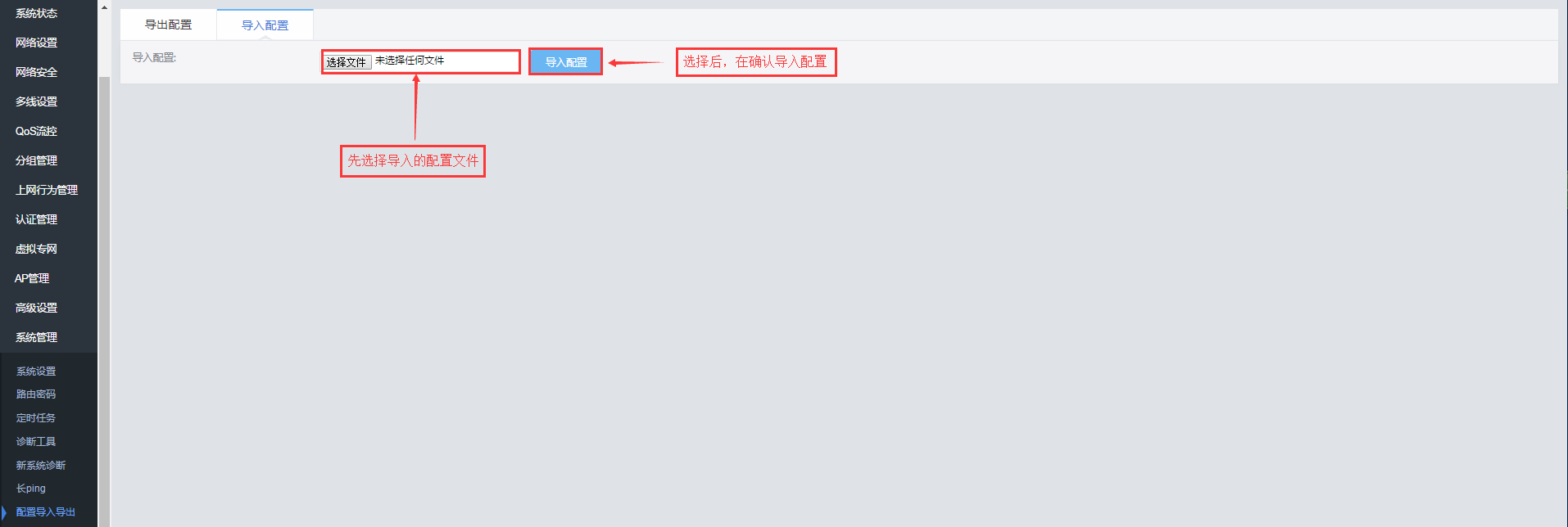 1、配置的导出2 、导入配置文件1、配置的导出导入导出路由器配置。方便用户管理快捷配置路由器。2 、导入配置文件把保存好的用户配置文件导入,方便用户快速配置路由器,或者恢复某个时间段的配置。请注意,1、 导入配置后, 设备会自动重启;2.、不同机型之间请勿进行配置导入。文档更新时间: 2020-02-25 15:18 作者:admin
