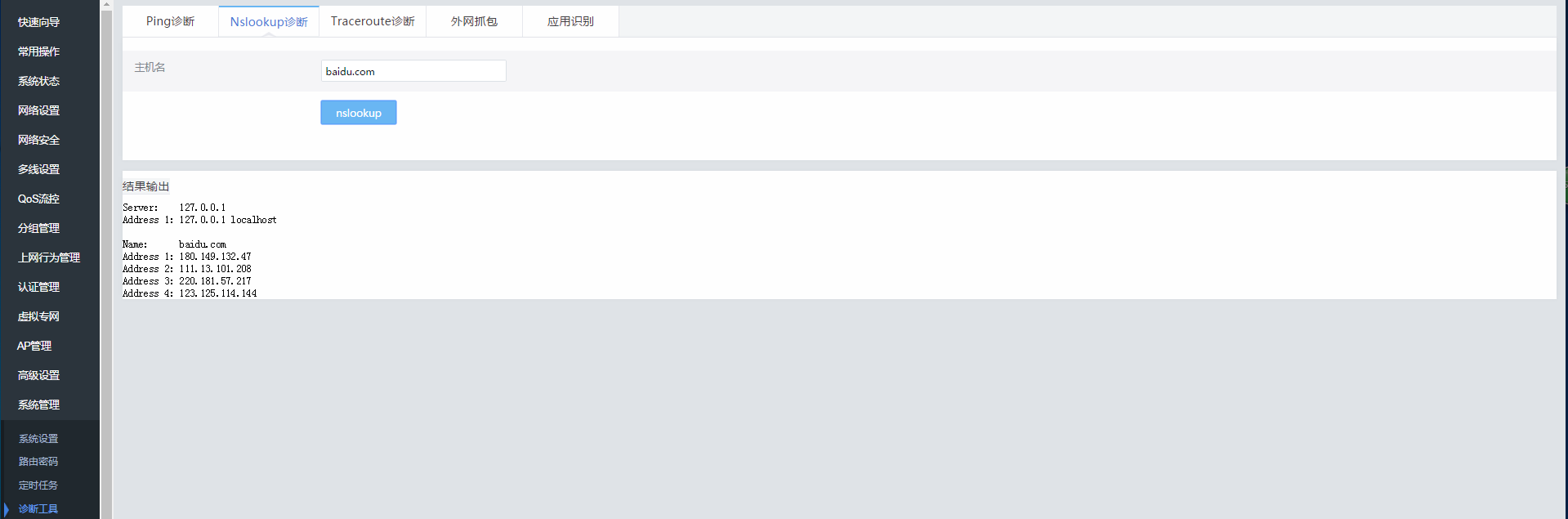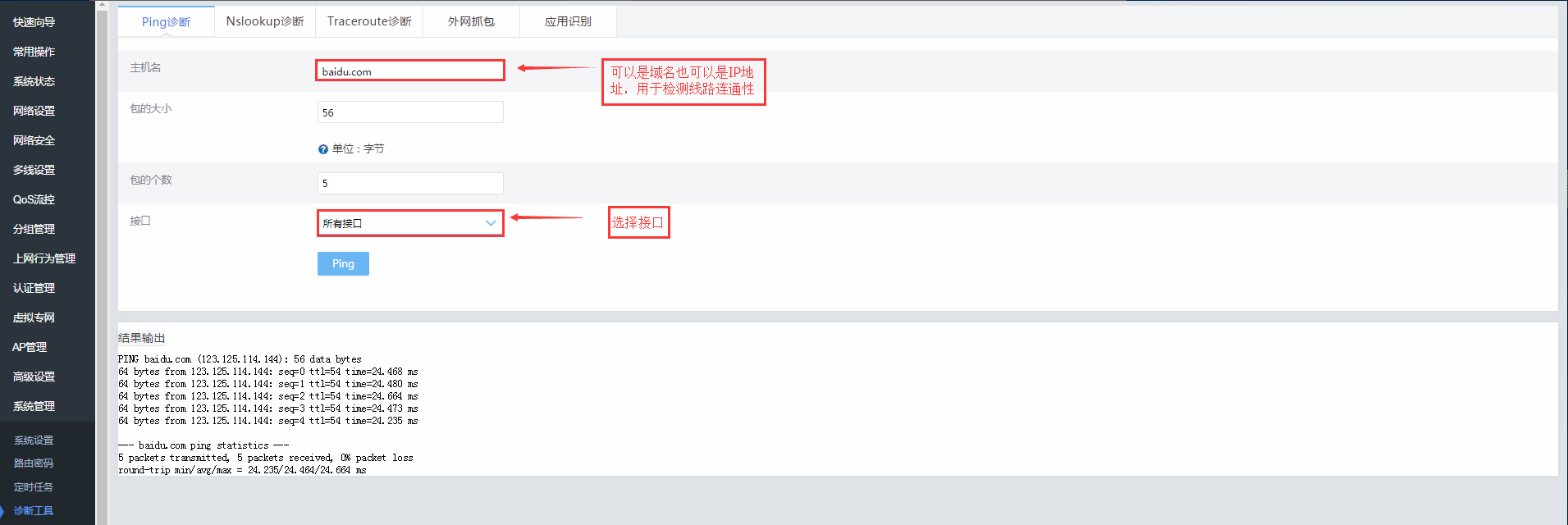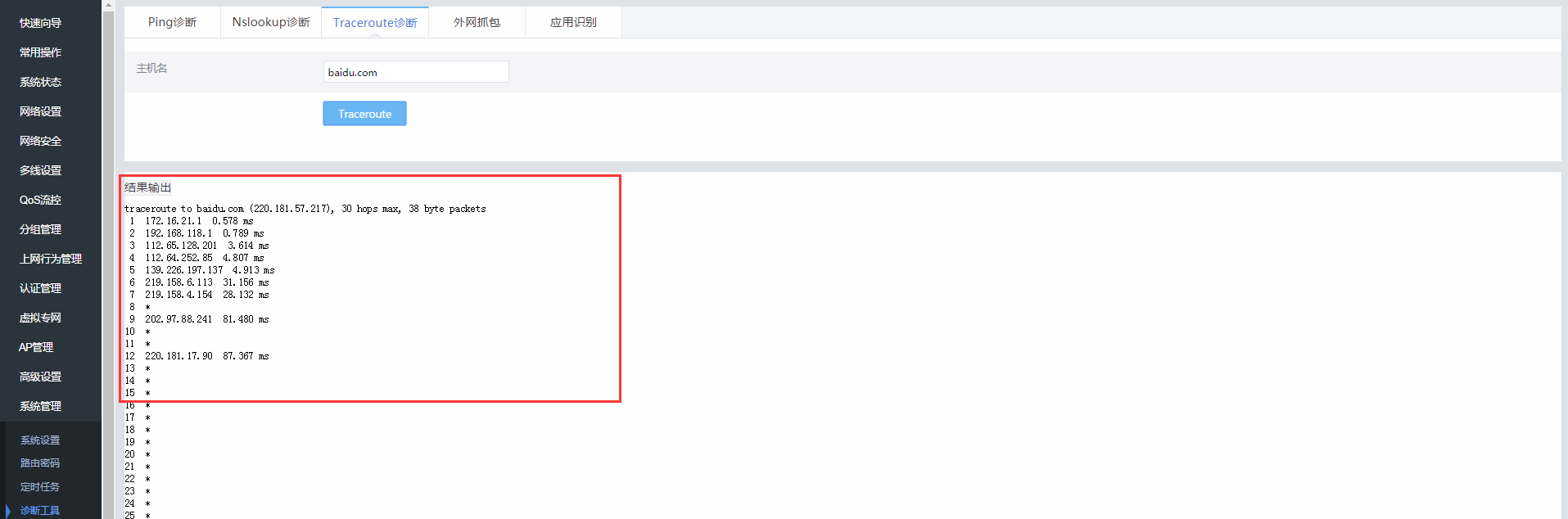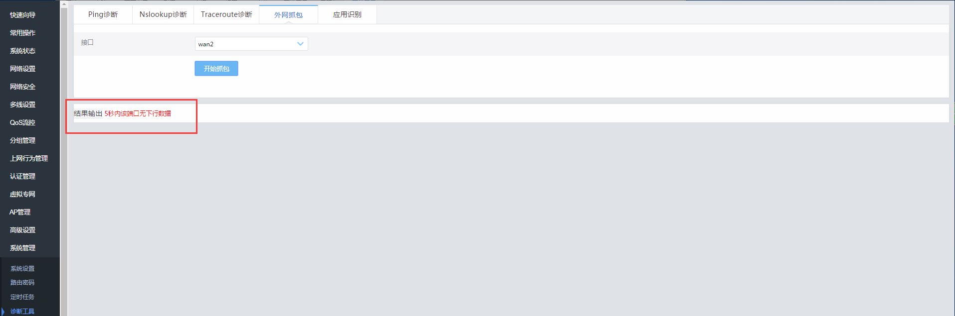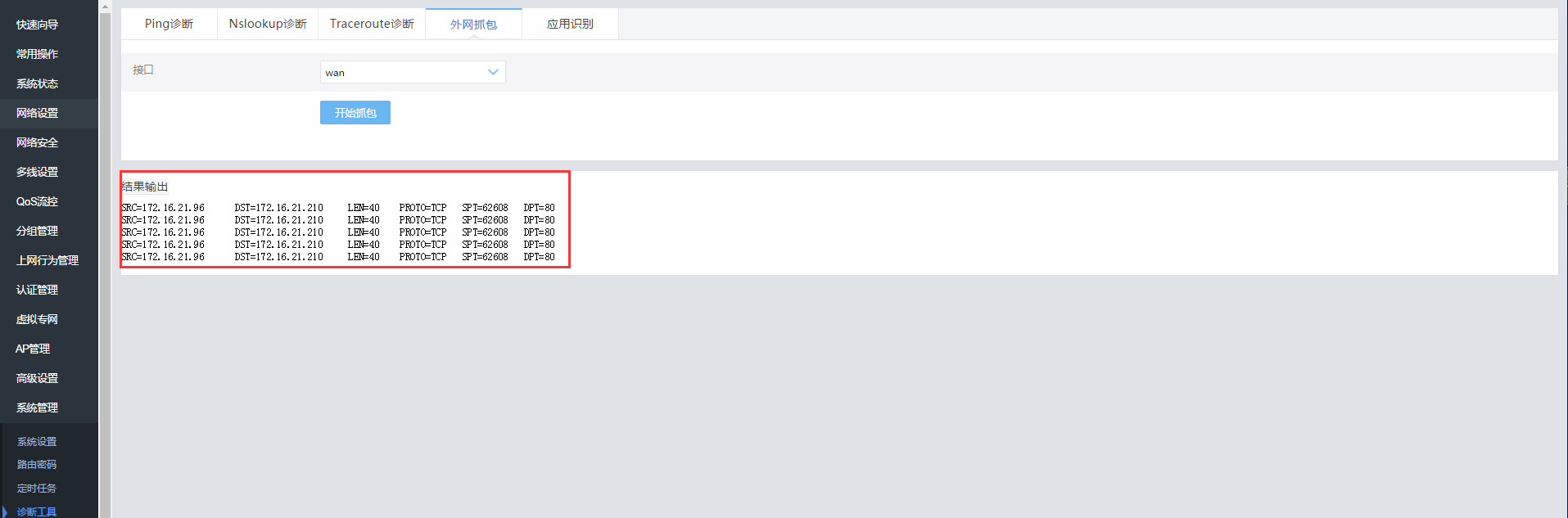 目录 搜索 目录介绍AC路由对接凌风计费第三方Potal认证一,快速配置上网教程1.1 配置认证弹窗(一键认证)1.2 设置自动重播外线1.3 常用限速,匹配IP地址1.4 流控AC双机热备1.5 流控AC双机热备(简易版)二,设置向导2.1 快速向导2.2 专家向导三,系统状态3.1 概览3.2 路由3.3 实时监控3.4 历史监控3.5 主机监控3.6 应用统计3.7 QQ在线列表3.8 接口概览四,常用操作4.1 Qos流控4.2 内网配置4.3 DHCP4.4 路由密码4.5 端口映射4.6 外网配置4.7 多线策略4.8 ARP绑定五,网络设置5.1 接口概览5.2 外网配置5.3 内网配置5.4 DHCP5.5 DNS5.6 主机名5.7 静态路由5.8 动态域名六,多线设置6.1 多线策略6.2 单线多拨6.3 WAN口扩展七,Qos流控7.1 智能流控7.2 固定流控八,网络安全8.1 ARP绑定8.2 ARP安全8.3 ARP信任8.4 MAC过滤8.5 端口映射8.6 连接数限制8.7 DDos攻击防御九,分组管理9.1 IP组9.2 时间组9.3 端口组9.4 应用组9.5 MAC组9.6 域名组十,行为管理10.1 一键管控10.2 QQ在线列表10.3 QQ白名单10.4 网址过滤10.5 防火墙规则10.6 URL重定向10.7 WEB访问记录10.8 DNS过滤十一,虚拟专网11.1 PPTP服务器11.2 PPTP客户端11.3 L2TP服务器11.4 L2TP客户端11.5 IPSec十二,认证管理12.1 PPPoE服务器12.2 RADIUS设置12.3 账号管理12.4 用户列表12.5 消息推送十三,AP管理13.1 基础设置13.2 高级设置13.3 设备管理13.4 监控统计十四,高级设置14.1 接口高级设置14.2 接口设置14.3 防二级路由14.4 共享破解14.5 UPNP14.6 VLAN14.7 弹性端口14.8 UDP广播中继14.9 PPPoE中继14.10 接口绑定14.11 端口镜像十五,系统管理15.1 系统设置15.2 路由密码15.3 加入云端15.4 定时任务15.5 新系统诊断15.6 配置导入导出15.7 恢复出厂配置15.8 WEB访问管理15.9 特征库管理15.10 固件升级15.11 重启十六,系统工具16.1 诊断工具16.2 长Ping16.3 一键测速16.4 清理连接 暂无相关搜索结果! 本文档由 智慧光迅 发布 16.1 诊断工具 1、Ping工具2、NSLookup3、Traceroute4 、外网抓包1、Ping工具用于诊断连通性。2、NSLookup域名解析查询,一般多用邮件排障。3、Traceroute用于查找路径,定位故障点。4 、外网抓包选择外网出接口,选择外网出接口,抓取5秒内从该接口通过的流量外网抓包,指定一个外网出接口,单击开始抓包,系统默认抓取5秒内从该接口通过的流量,如上图;外网抓包,若是5秒中内该接口无流量通过将提升,“5秒内该端口无下行文档更新时间: 2020-02-25 15:18 作者:admin