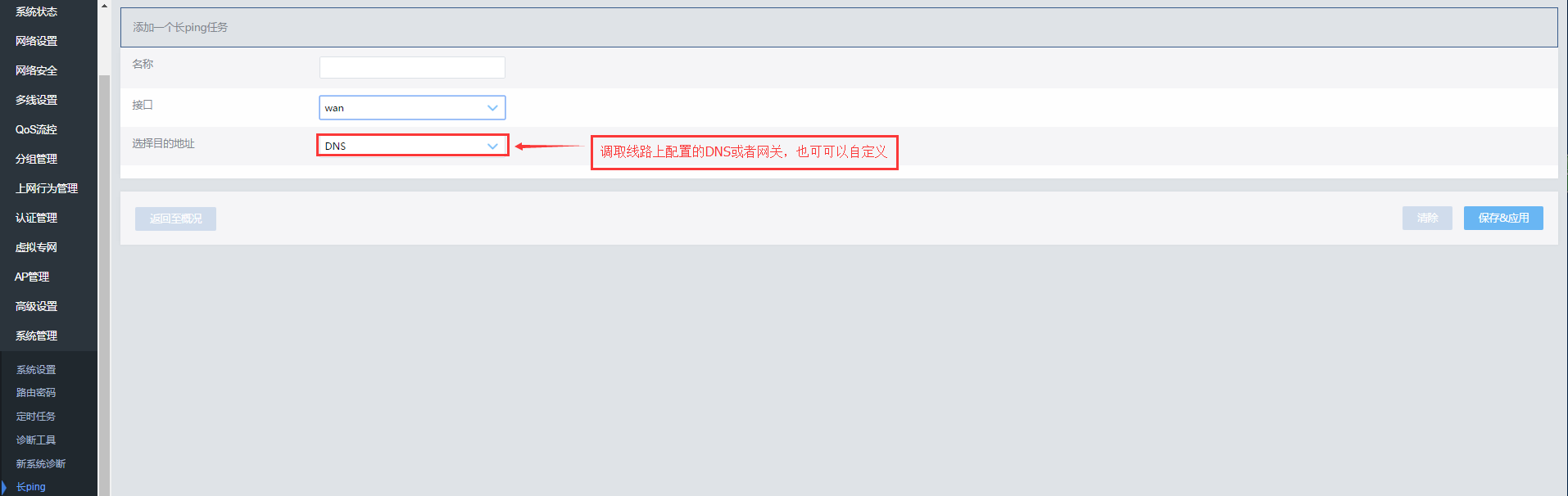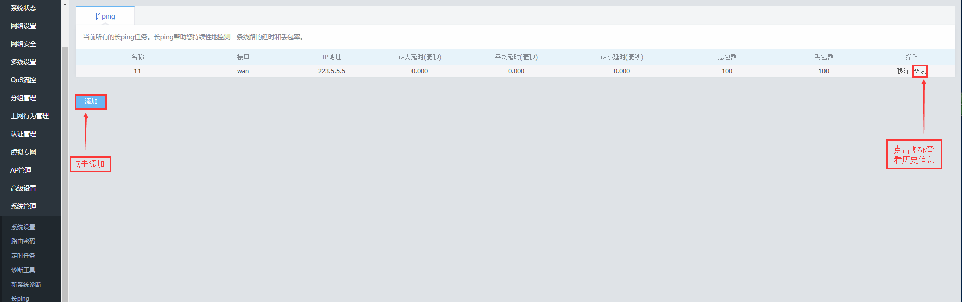 目录 搜索 目录介绍AC路由对接凌风计费第三方Potal认证一,快速配置上网教程1.1 配置认证弹窗(一键认证)1.2 设置自动重播外线1.3 常用限速,匹配IP地址1.4 流控AC双机热备1.5 流控AC双机热备(简易版)二,设置向导2.1 快速向导2.2 专家向导三,系统状态3.1 概览3.2 路由3.3 实时监控3.4 历史监控3.5 主机监控3.6 应用统计3.7 QQ在线列表3.8 接口概览四,常用操作4.1 Qos流控4.2 内网配置4.3 DHCP4.4 路由密码4.5 端口映射4.6 外网配置4.7 多线策略4.8 ARP绑定五,网络设置5.1 接口概览5.2 外网配置5.3 内网配置5.4 DHCP5.5 DNS5.6 主机名5.7 静态路由5.8 动态域名六,多线设置6.1 多线策略6.2 单线多拨6.3 WAN口扩展七,Qos流控7.1 智能流控7.2 固定流控八,网络安全8.1 ARP绑定8.2 ARP安全8.3 ARP信任8.4 MAC过滤8.5 端口映射8.6 连接数限制8.7 DDos攻击防御九,分组管理9.1 IP组9.2 时间组9.3 端口组9.4 应用组9.5 MAC组9.6 域名组十,行为管理10.1 一键管控10.2 QQ在线列表10.3 QQ白名单10.4 网址过滤10.5 防火墙规则10.6 URL重定向10.7 WEB访问记录10.8 DNS过滤十一,虚拟专网11.1 PPTP服务器11.2 PPTP客户端11.3 L2TP服务器11.4 L2TP客户端11.5 IPSec十二,认证管理12.1 PPPoE服务器12.2 RADIUS设置12.3 账号管理12.4 用户列表12.5 消息推送十三,AP管理13.1 基础设置13.2 高级设置13.3 设备管理13.4 监控统计十四,高级设置14.1 接口高级设置14.2 接口设置14.3 防二级路由14.4 共享破解14.5 UPNP14.6 VLAN14.7 弹性端口14.8 UDP广播中继14.9 PPPoE中继14.10 接口绑定14.11 端口镜像十五,系统管理15.1 系统设置15.2 路由密码15.3 加入云端15.4 定时任务15.5 新系统诊断15.6 配置导入导出15.7 恢复出厂配置15.8 WEB访问管理15.9 特征库管理15.10 固件升级15.11 重启十六,系统工具16.1 诊断工具16.2 长Ping16.3 一键测速16.4 清理连接 暂无相关搜索结果! 本文档由 智慧光迅 发布 16.2 长Ping 长PING长PING用于检测线路路质量的感觉,统计网络情况,记录延时,掉包等数据文档更新时间: 2020-02-25 14:59 作者:admin