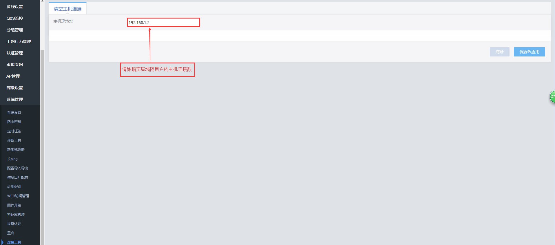 目录 搜索 目录介绍AC路由对接凌风计费第三方Potal认证一,快速配置上网教程1.1 配置认证弹窗(一键认证)1.2 设置自动重播外线1.3 常用限速,匹配IP地址1.4 流控AC双机热备1.5 流控AC双机热备(简易版)二,设置向导2.1 快速向导2.2 专家向导三,系统状态3.1 概览3.2 路由3.3 实时监控3.4 历史监控3.5 主机监控3.6 应用统计3.7 QQ在线列表3.8 接口概览四,常用操作4.1 Qos流控4.2 内网配置4.3 DHCP4.4 路由密码4.5 端口映射4.6 外网配置4.7 多线策略4.8 ARP绑定五,网络设置5.1 接口概览5.2 外网配置5.3 内网配置5.4 DHCP5.5 DNS5.6 主机名5.7 静态路由5.8 动态域名六,多线设置6.1 多线策略6.2 单线多拨6.3 WAN口扩展七,Qos流控7.1 智能流控7.2 固定流控八,网络安全8.1 ARP绑定8.2 ARP安全8.3 ARP信任8.4 MAC过滤8.5 端口映射8.6 连接数限制8.7 DDos攻击防御九,分组管理9.1 IP组9.2 时间组9.3 端口组9.4 应用组9.5 MAC组9.6 域名组十,行为管理10.1 一键管控10.2 QQ在线列表10.3 QQ白名单10.4 网址过滤10.5 防火墙规则10.6 URL重定向10.7 WEB访问记录10.8 DNS过滤十一,虚拟专网11.1 PPTP服务器11.2 PPTP客户端11.3 L2TP服务器11.4 L2TP客户端11.5 IPSec十二,认证管理12.1 PPPoE服务器12.2 RADIUS设置12.3 账号管理12.4 用户列表12.5 消息推送十三,AP管理13.1 基础设置13.2 高级设置13.3 设备管理13.4 监控统计十四,高级设置14.1 接口高级设置14.2 接口设置14.3 防二级路由14.4 共享破解14.5 UPNP14.6 VLAN14.7 弹性端口14.8 UDP广播中继14.9 PPPoE中继14.10 接口绑定14.11 端口镜像十五,系统管理15.1 系统设置15.2 路由密码15.3 加入云端15.4 定时任务15.5 新系统诊断15.6 配置导入导出15.7 恢复出厂配置15.8 WEB访问管理15.9 特征库管理15.10 固件升级15.11 重启十六,系统工具16.1 诊断工具16.2 长Ping16.3 一键测速16.4 清理连接 暂无相关搜索结果! 本文档由 智慧光迅 发布 16.4 清理连接 连接工具连接工具清除局域网用户的主机连接数文档更新时间: 2020-02-25 15:18 作者:admin