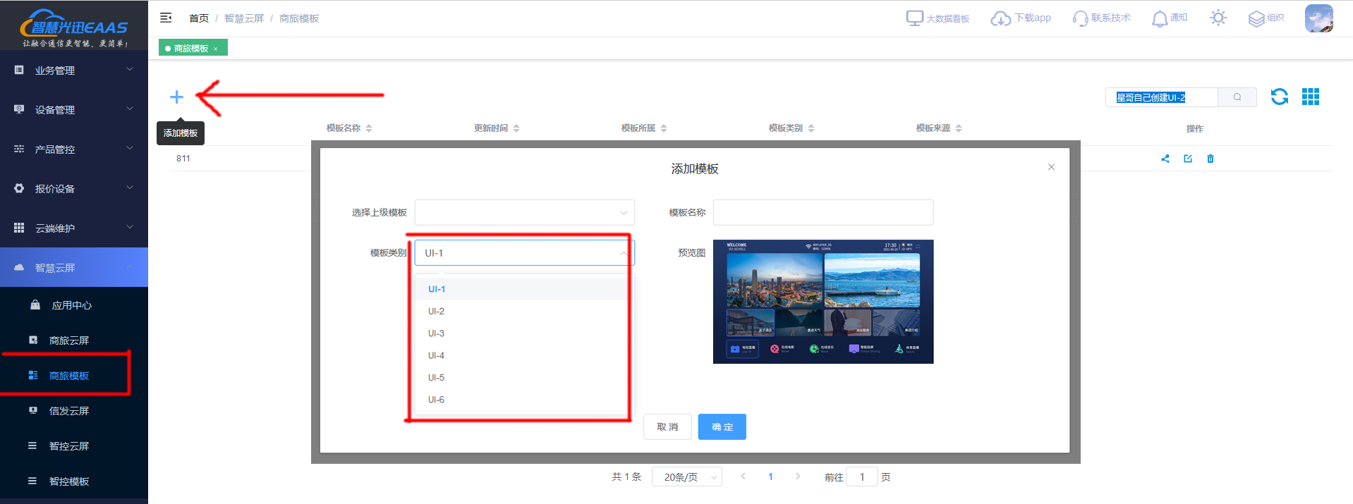 目录 搜索 一、常见问题① 直播列表更换替换地址② 分享模板给其他项目使用③ 智慧云屏的创建风格UI④ 关联自定义欢迎词二、商旅云屏云屏设置(设置向导)编辑后台(内容修改)1.开机启动页2.开机广告3.欢迎页4.主页5.基础配置三、信发云屏(广告屏)四、商旅云屏节目列表调用服务器五、商旅云屏UI介绍六、房价牌UI介绍6.1 横屏房价牌UI介绍6.2 竖屏房价牌UI介绍 暂无相关搜索结果! 本文档由 智慧光迅 发布 ③ 智慧云屏的创建风格UI 商旅云屏最新UIUI-1=酒店模板UI-2=小区模板(长按桌面可以更换后台所配的“应用中心”里面的APP)UI-3=罗马UI-4=捷克UI-5=维也纳注意创建模板的时候,开始会选着模板,选择好后无法随意修改风格UI,必须是新创建的时候才可以选择UI文档更新时间: 2022-09-20 10:14 作者:admin