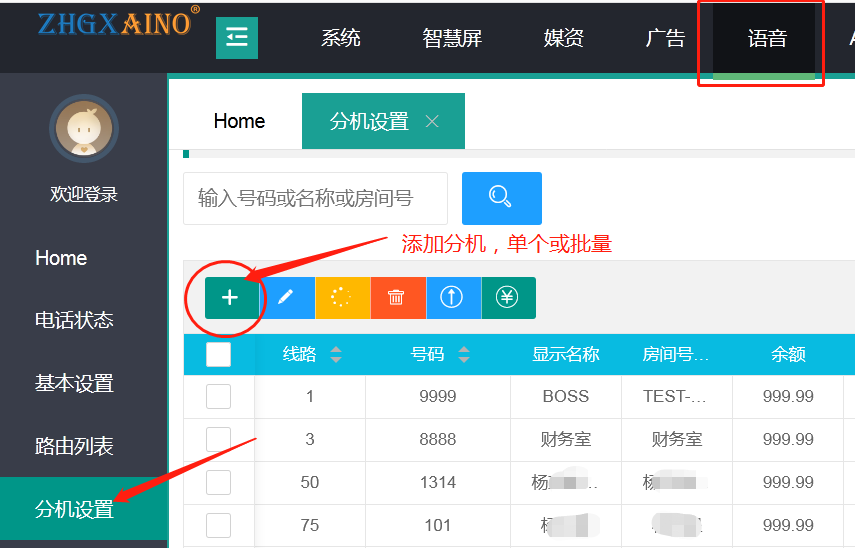 2:在语音、 分机设置,添加IP分机,添加需要注册的IP分机号码(添加账号密码)