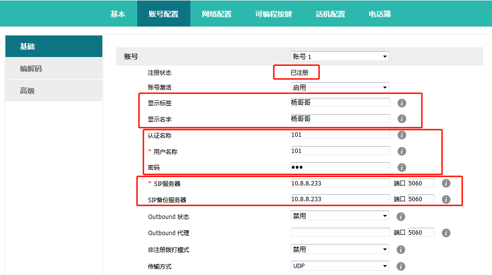- 找到账号管理,填SIP 主机号,端口常用5060 ,填注册分机、注册分机密码等(显示名称可以自定义!只是显示)