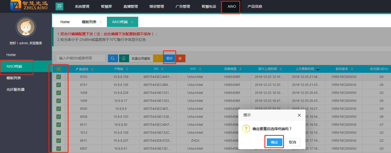 重启终端,可以批量勾选,批量下发重启任务(终端默认30分钟同步任务时间)