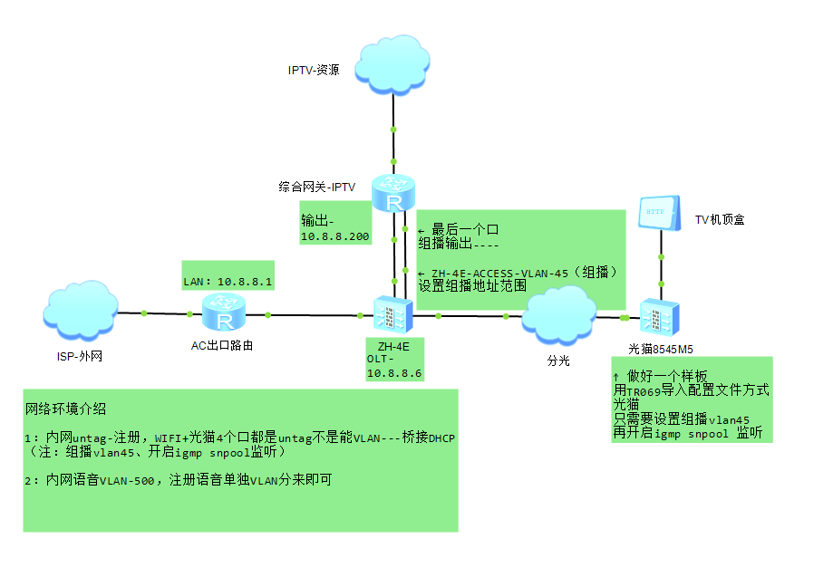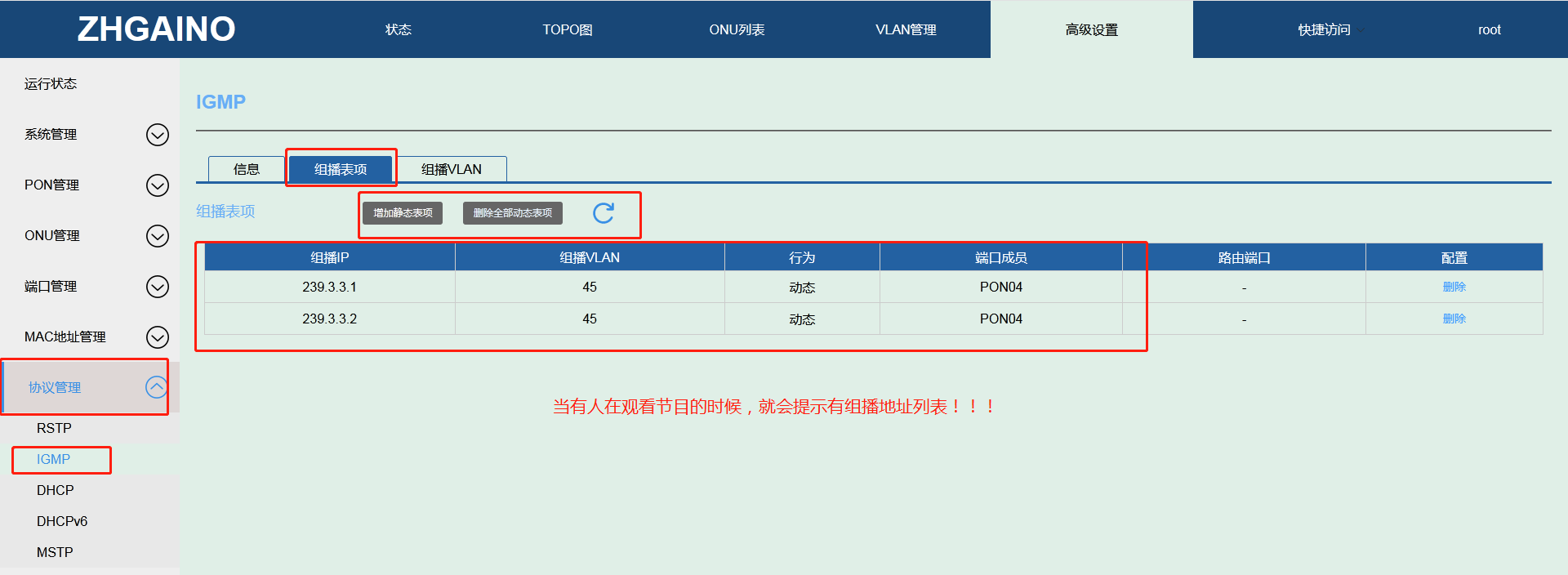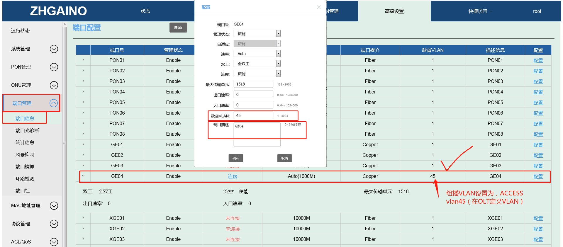 - 3:服务器组播输出已经完成—-设置OLT-4口为vlan45-access-VLAN(此环节判断为组播VLAN-45业务)