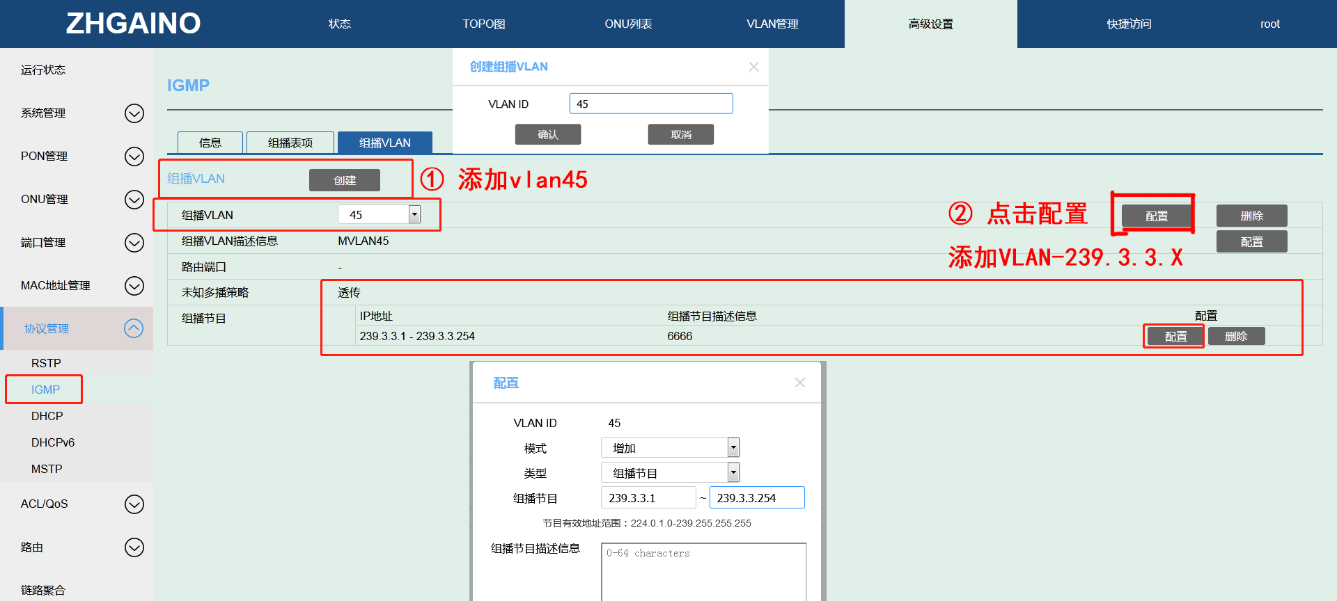 - 4:ZH-4E-开启组播vlan45,开启组播地址:239.3.3.1-239.3.3.254范围